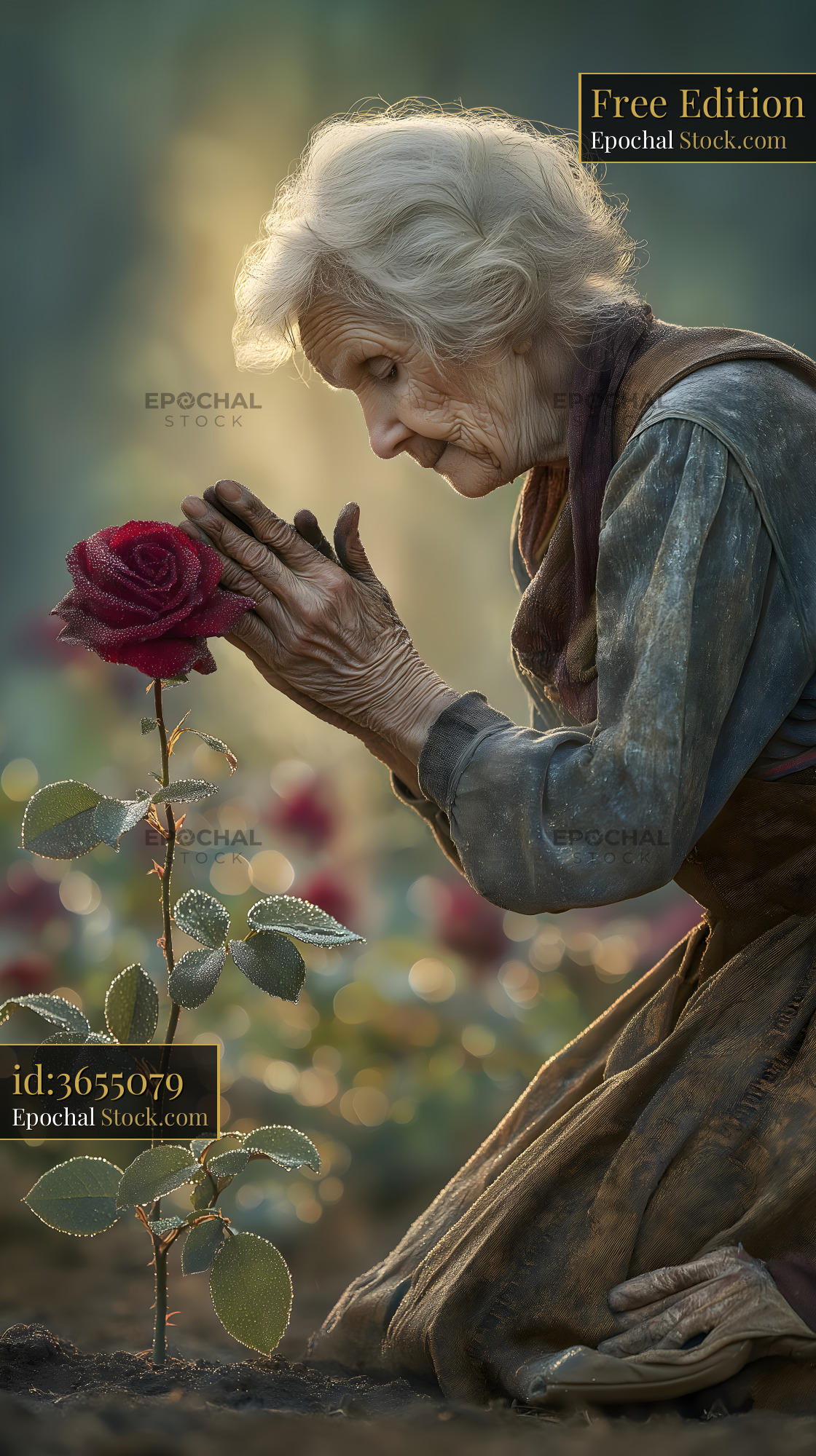 An elderly woman kneels in a garden, gently placing her hands together in front of a blooming red rose. The sun sets, casting warm light on the flowers around her.