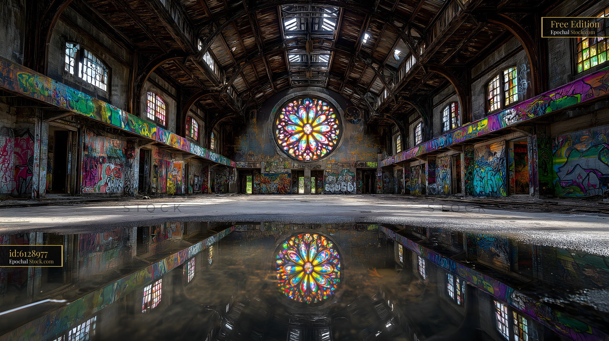 Inside an old building, bright colors from graffiti cover the walls. A large stained glass window reflects on the wet floor. Sunlight comes through the glass and creates patterns on the ground.