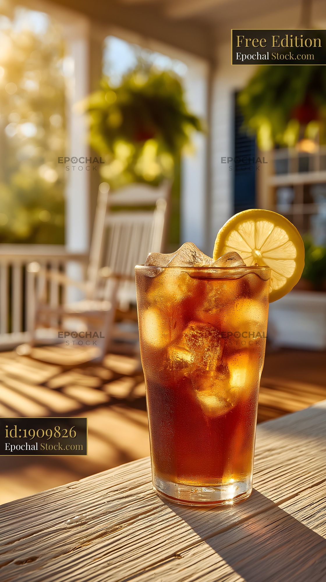 A glass of iced tea sits on a wooden table on a porch. The drink has ice cubes and a lemon slice. In the background, a rocking chair and hanging plants are visible under warm sunlight.