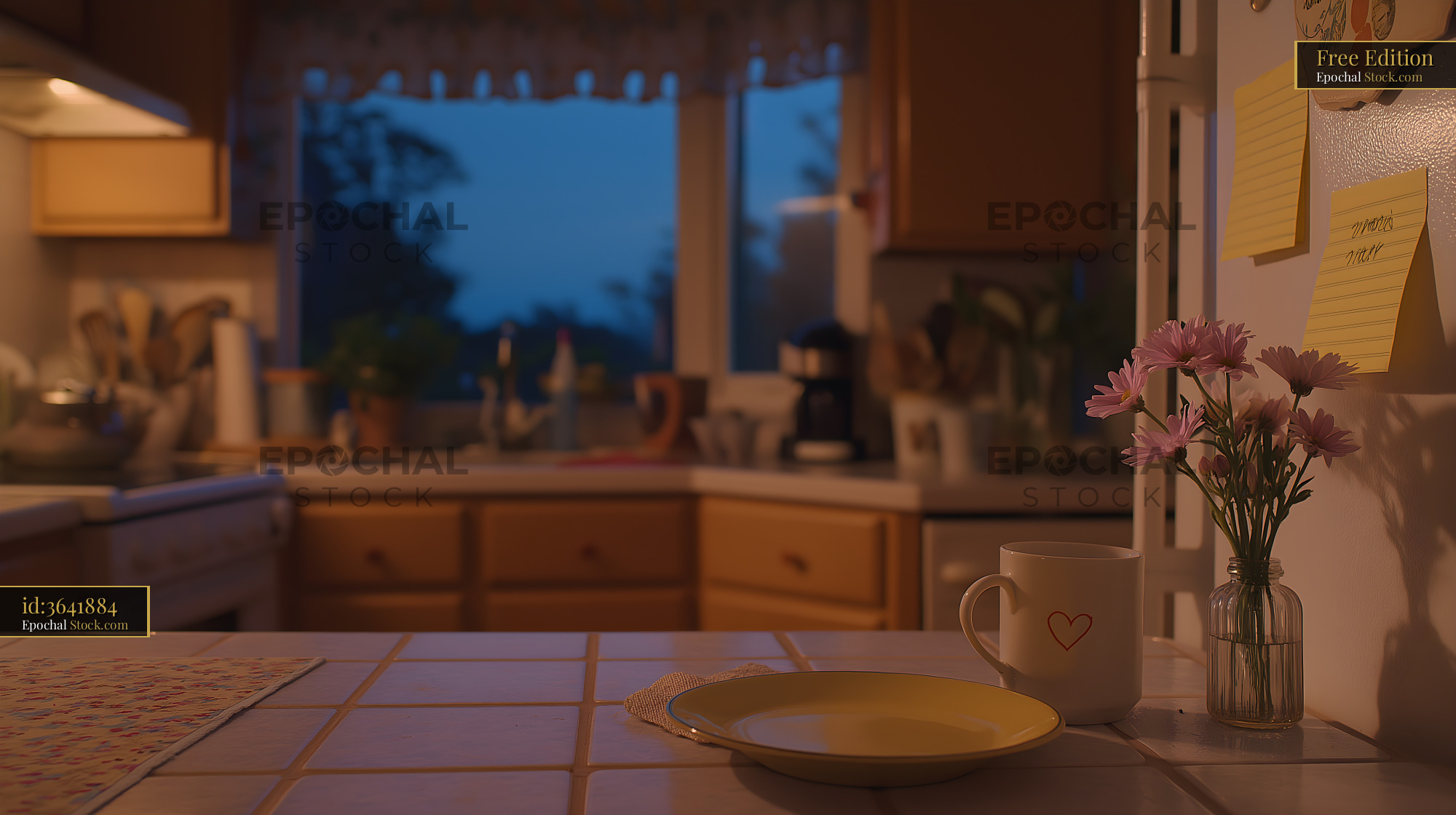 The kitchen is quiet in the evening. A yellow plate sits on the counter, beside a small vase with flowers. A cup rests nearby, and oven light shines softly.