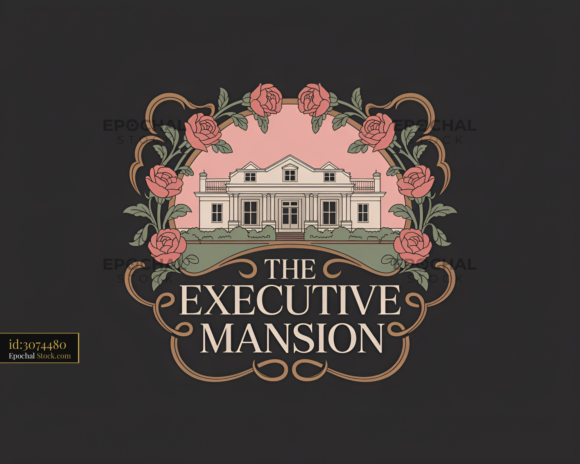 A graphic shows the Executive Mansion with roses around it. The scene has colors that suggest a sunset. The design focuses on the building and floral elements.