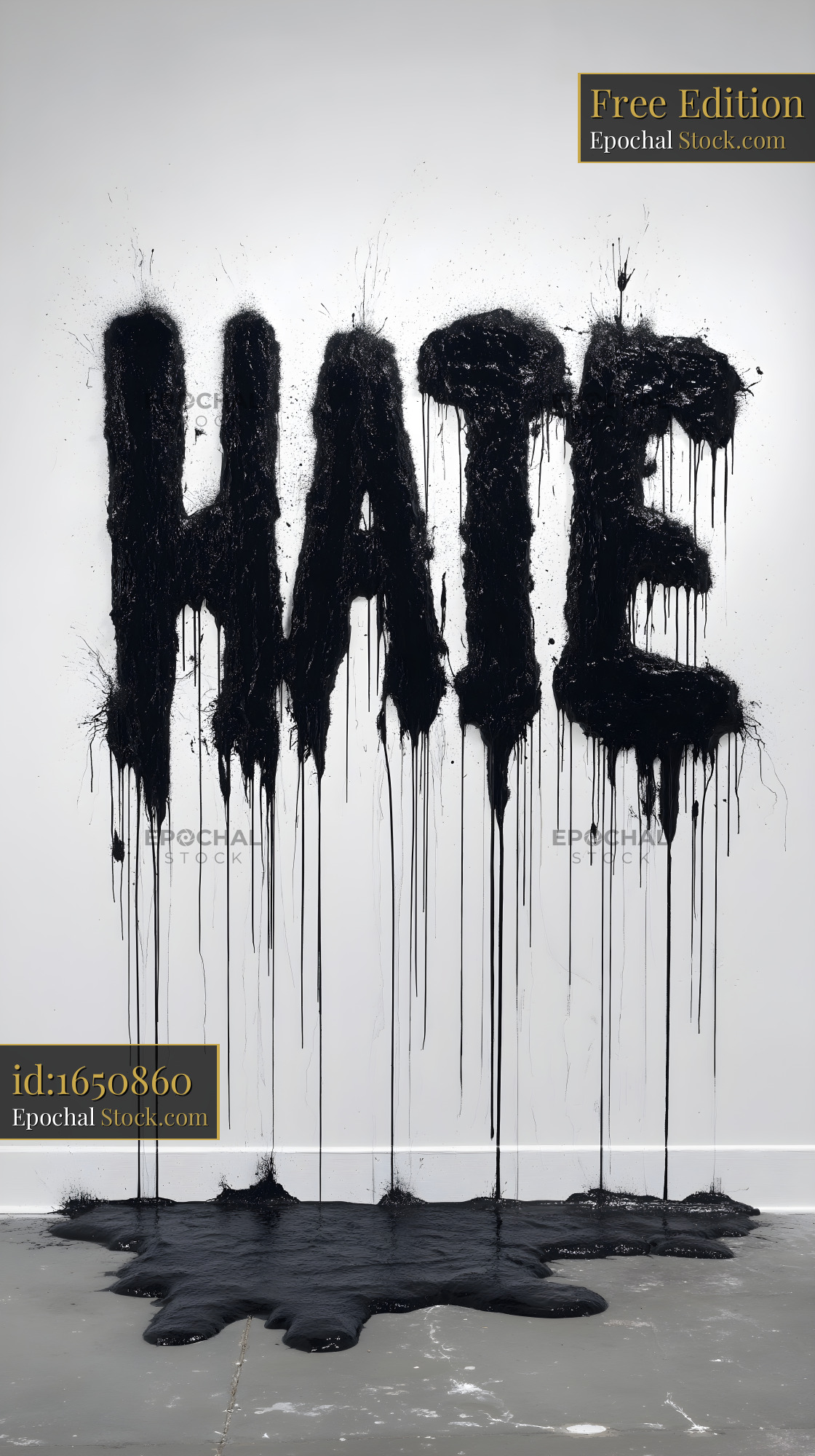 A wall displays the word hate painted in black. The paint drips down and creates puddles on the floor. This artwork explores difficult themes in a public space.