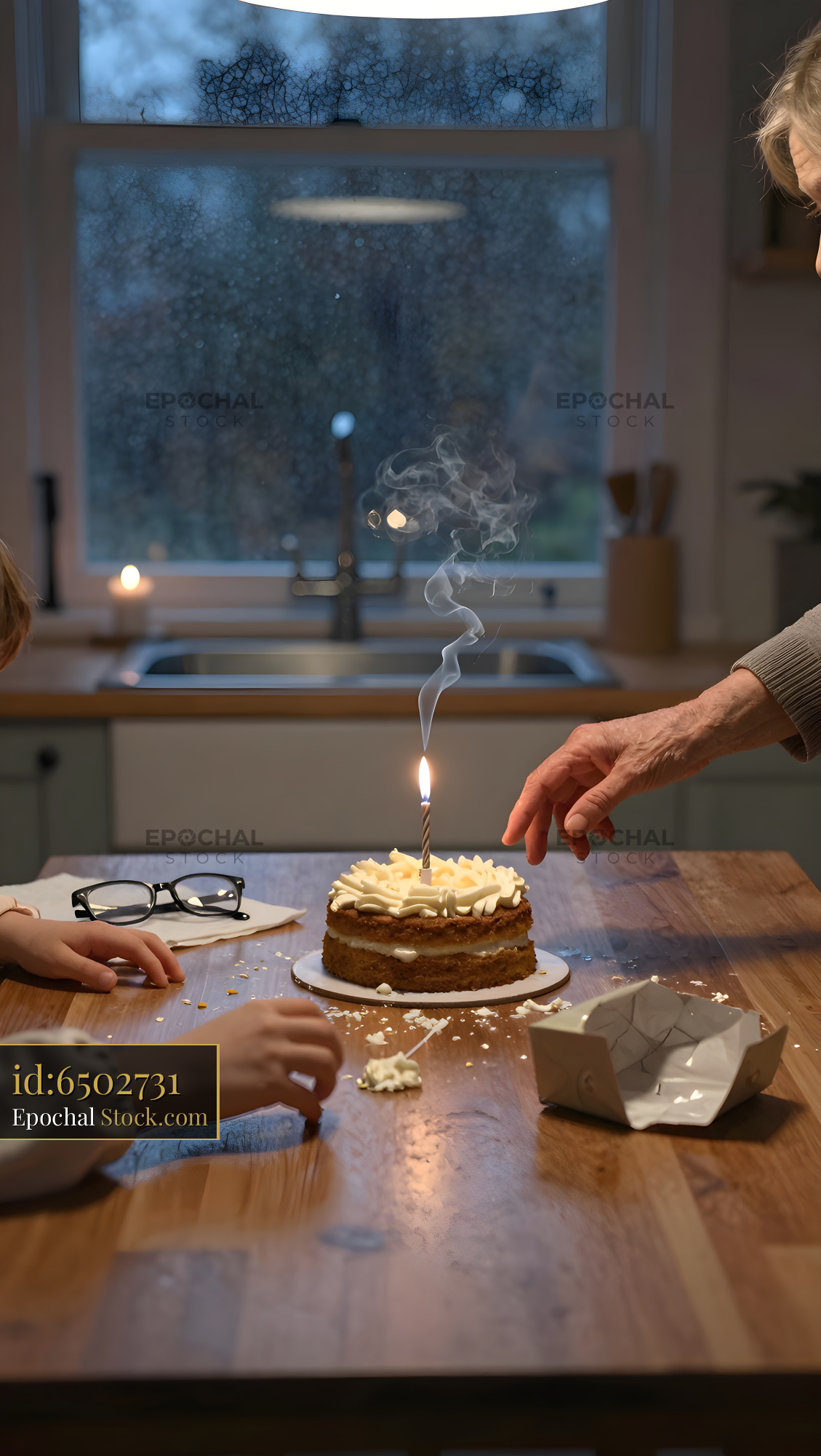 A child and an elderly person are in a kitchen. The child reaches for a cake with a lit candle. There is cake crumbs and glasses on the table. The window shows a rainy view outside.