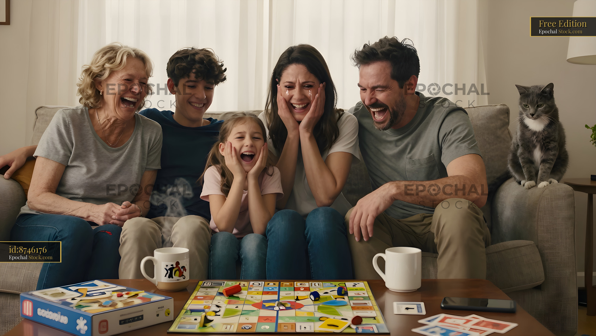 A group of five family members sit together in a living room. They play a board game on a table, laughing and showing excitement. A cat sits nearby, adding to the cozy atmosphere.