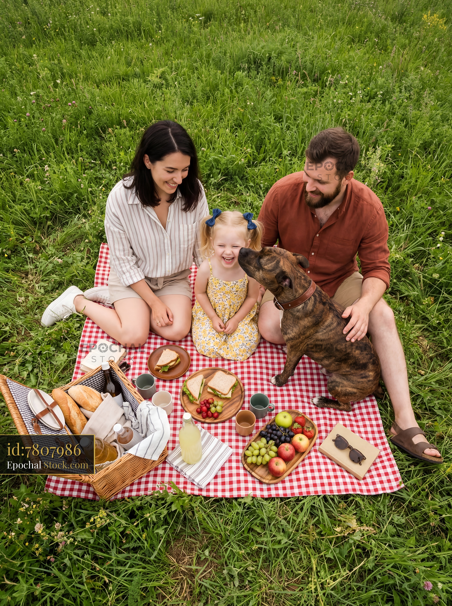 A family has a picnic on a blanket in the park. They sit together, eating food and playing with their dog. The sun shines bright and the grass is green. The child smiles and laughs.