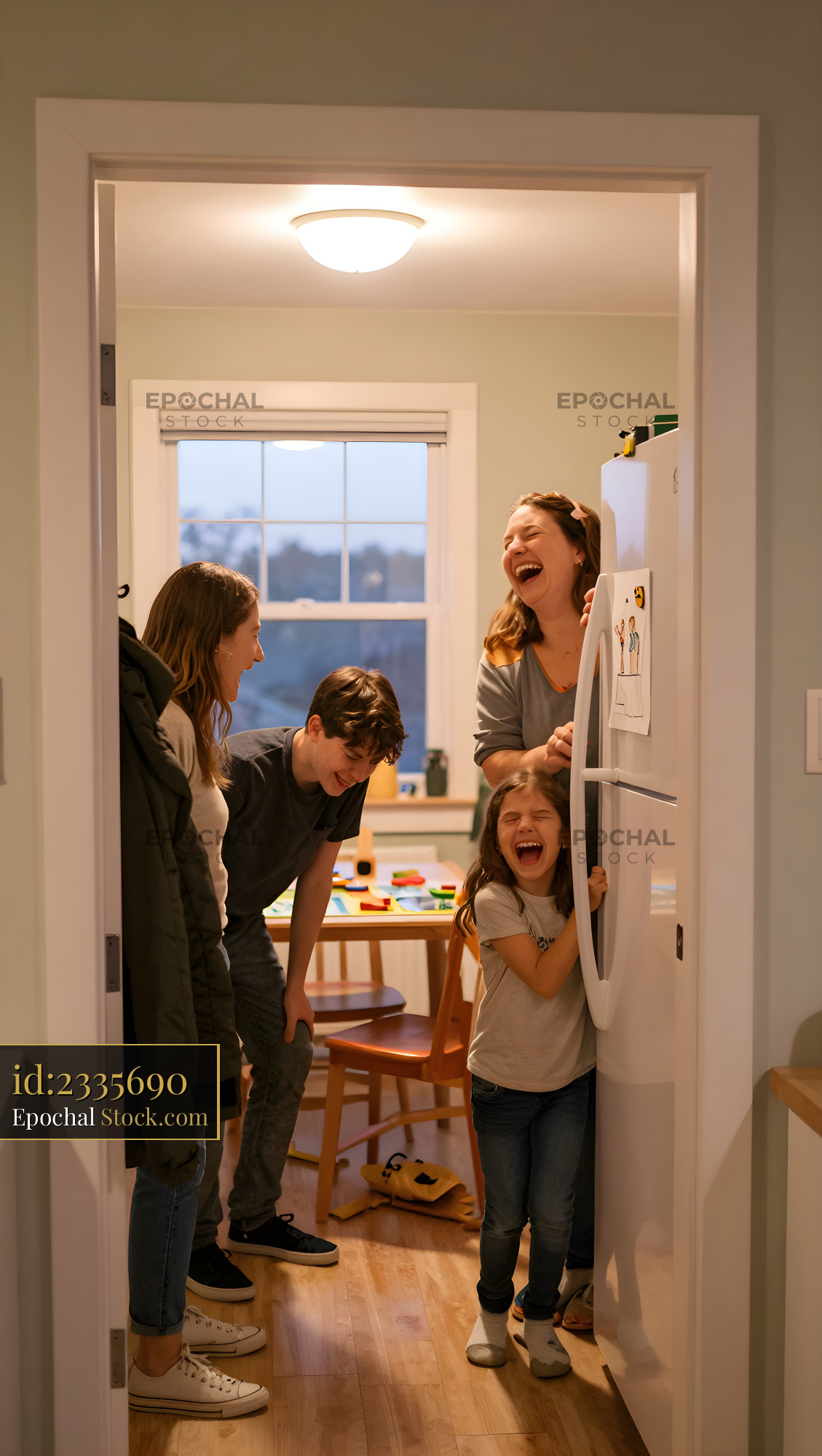 Four family members share a joyful moment in the kitchen. Two children play near the refrigerator while two adults laugh at the table. This scene captures fun and connection.