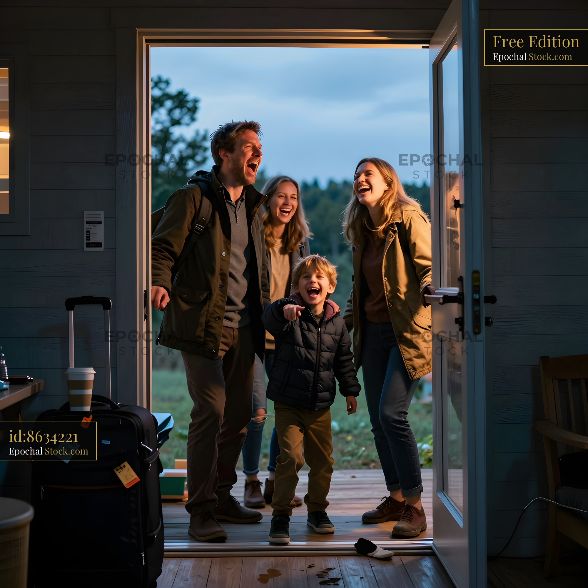 A family gathers at the cabin entrance during the evening. They laugh and smile as they welcome each other, sharing joy in their reunion. Luggage sits nearby in the background.