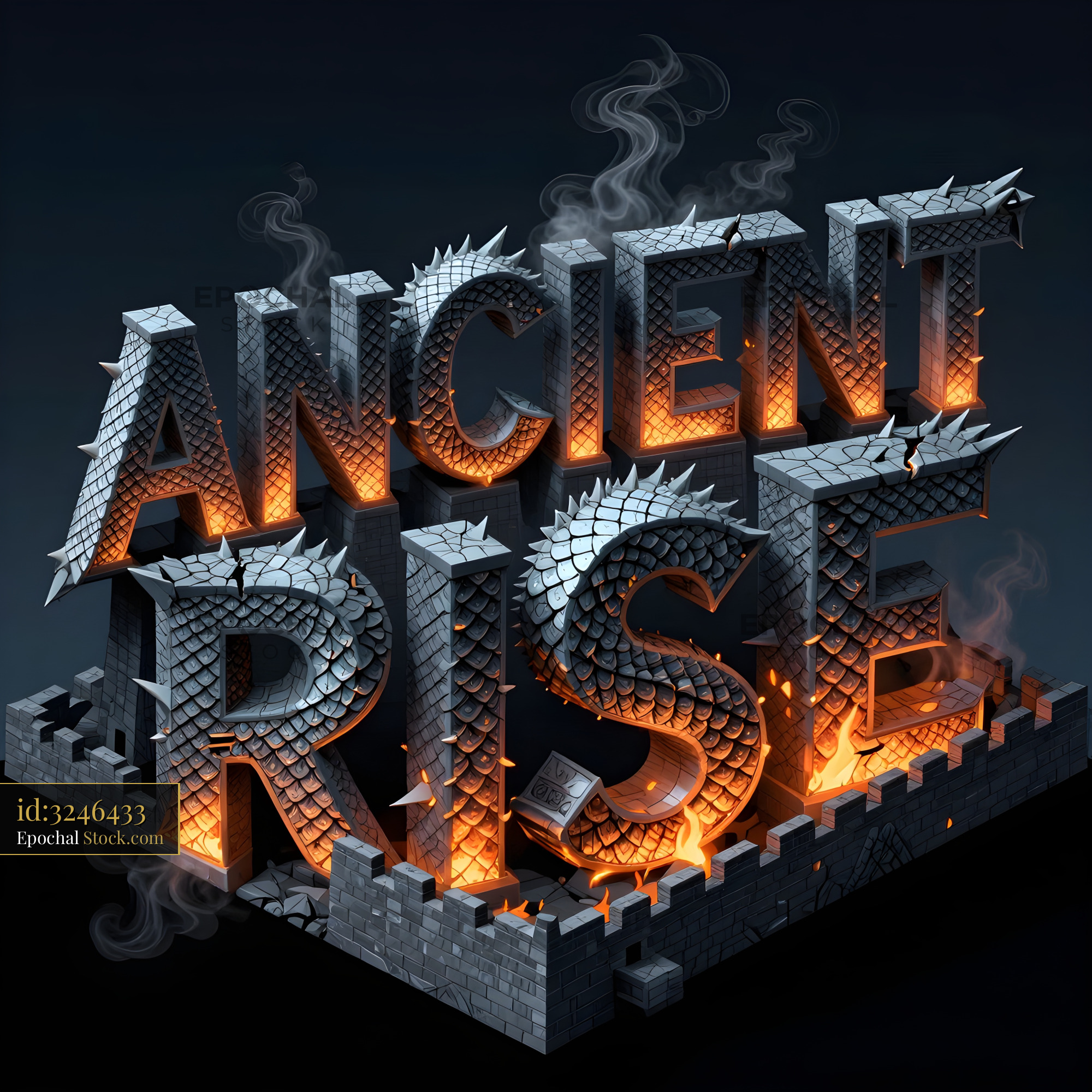 A graphic shows large stone letters spelling out ancient rise. Flames and smoke surround the letters. A castle wall supports the words, creating a fantasy atmosphere.