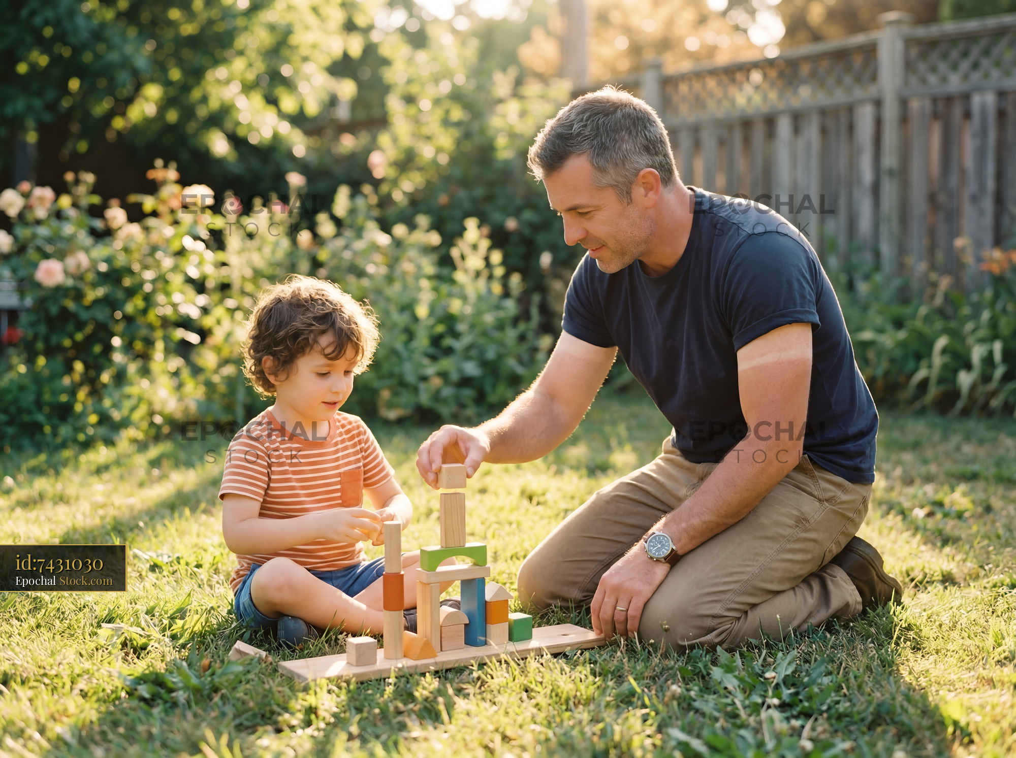 A man and a child build a structure with colorful blocks in a backyard. They sit on green grass surrounded by flowers. It is a sunny day in summer.