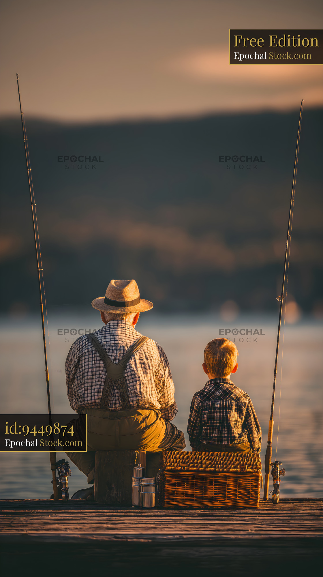 Grandfather and grandson fish together on a dock. They both sit on the edge, surrounded by fishing rods. The sun sets, casting warm light across the lake and hills in the background.
