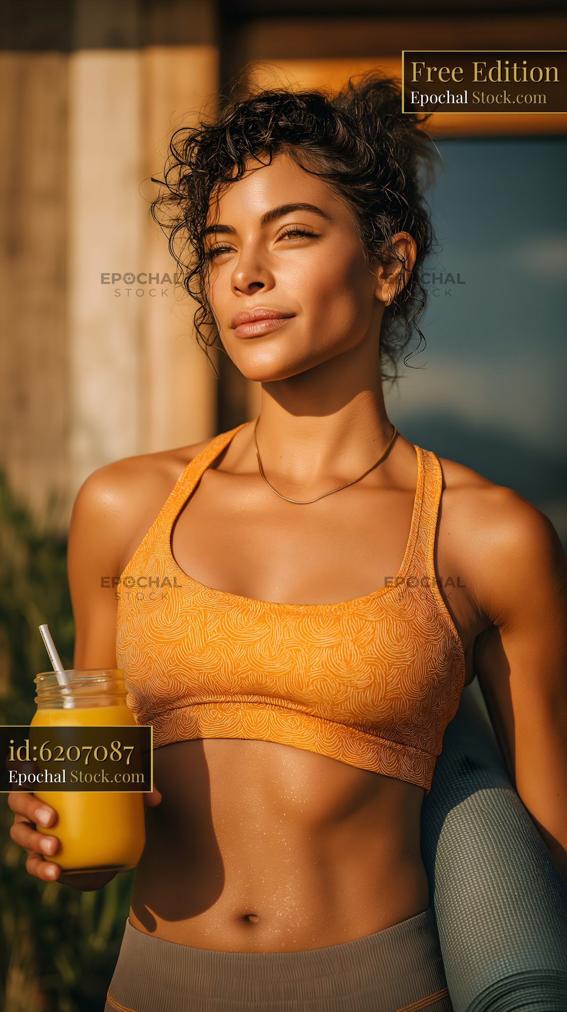 Fit woman stands outside wearing an orange sports bra and gray leggings. She holds a yellow smoothie in a jar and a rolled yoga mat.