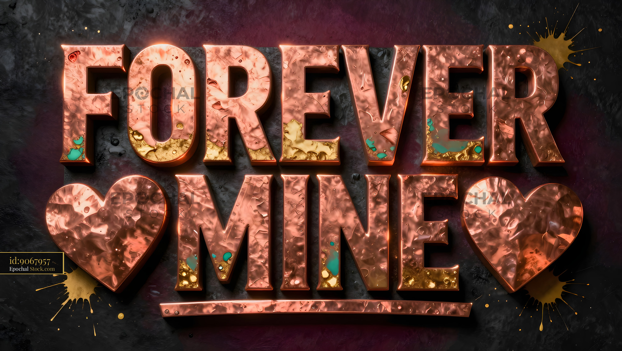 The words forever mine in large, shiny letters. The letters are gold and copper and have a textured surface. The background has dark colors with paint splatters.