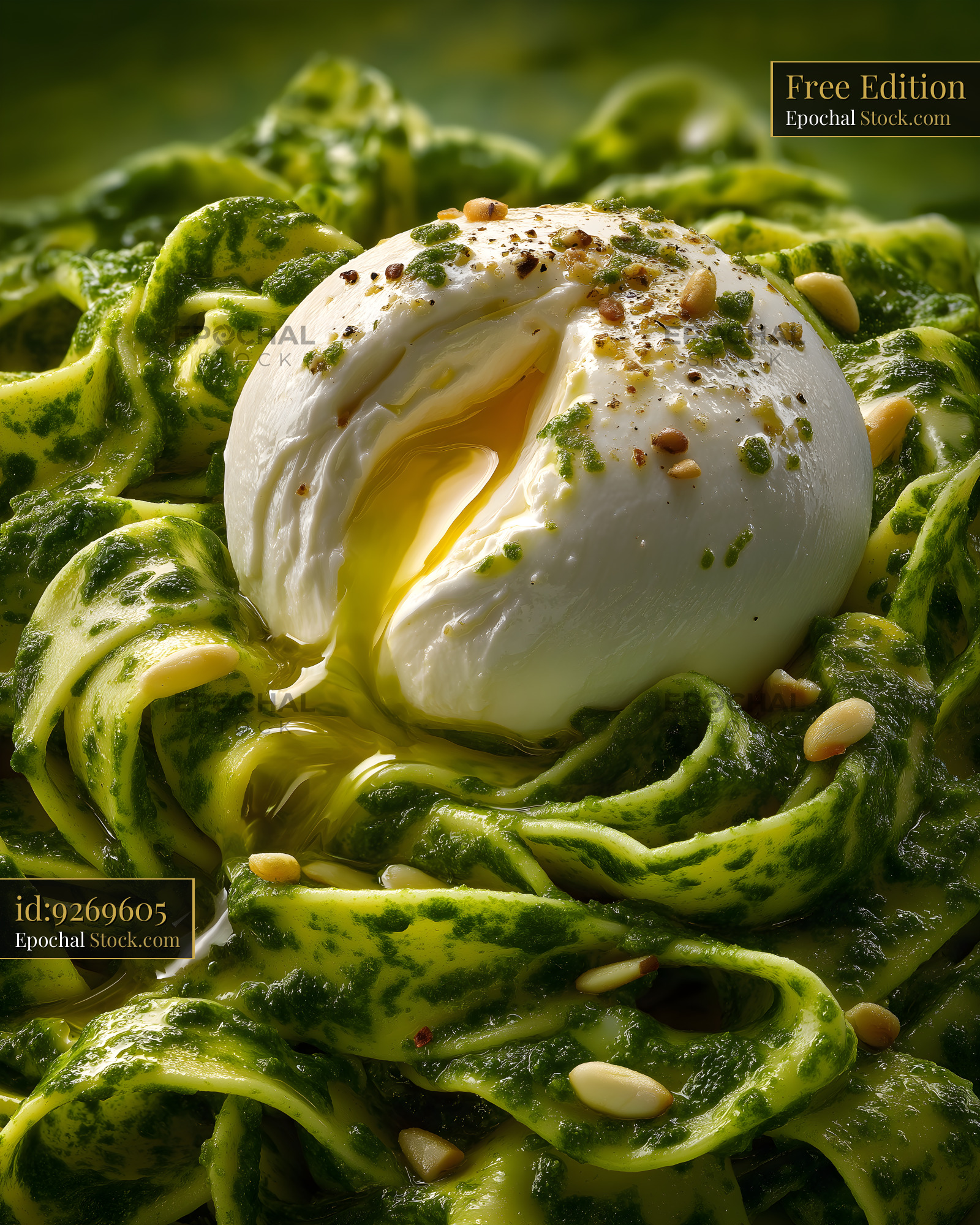 Fresh green pasta with a poached egg on top Free Premium Stock Image