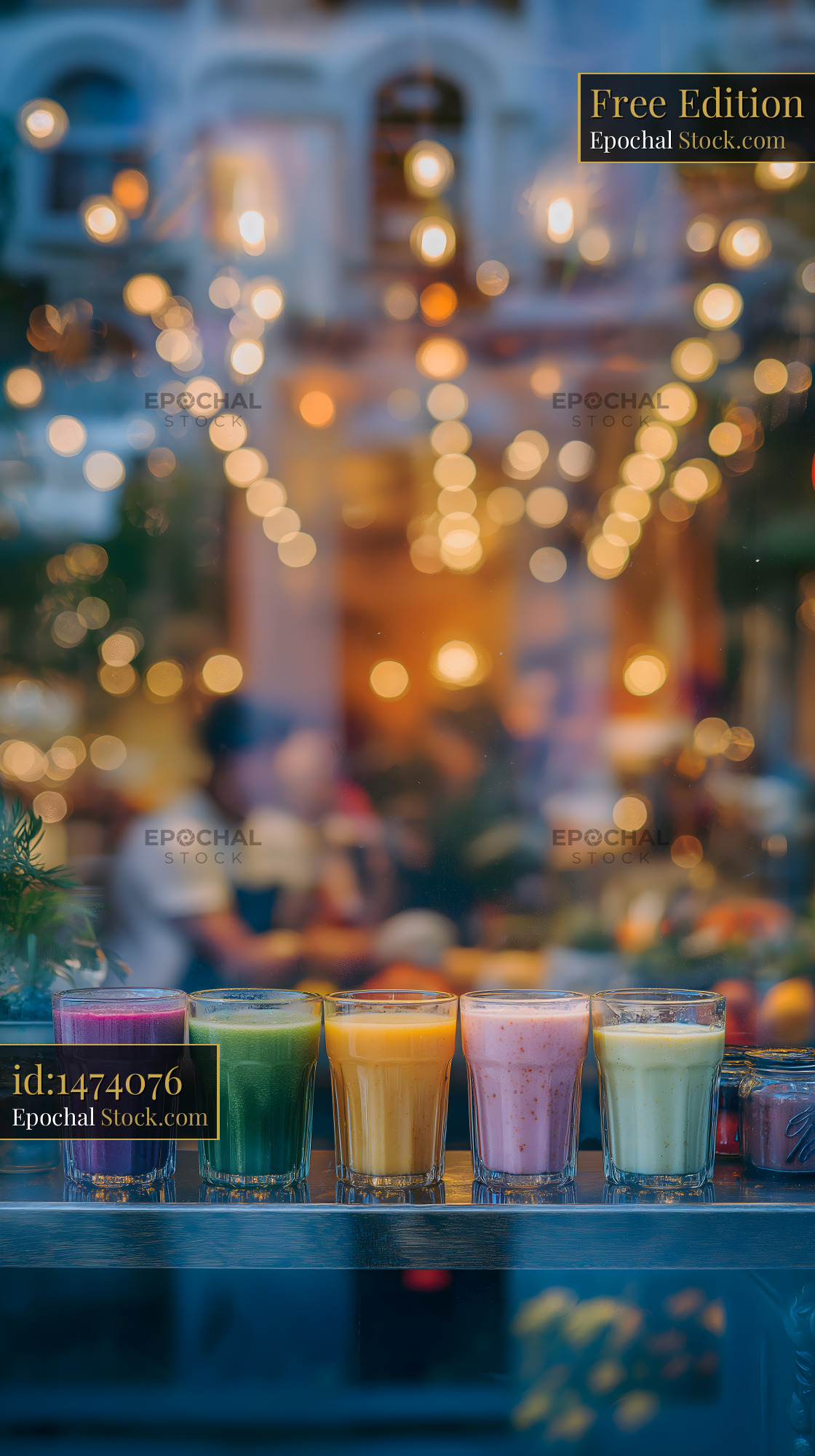 Five glasses of colorful juices are lined up on a table outside a cafe. People are visible in the background. Bright lights shine around the area during the evening.