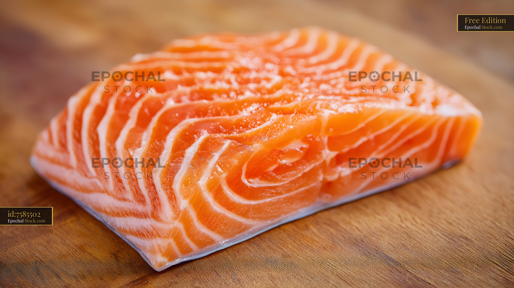 A fresh salmon fillet placed on a wooden cutting board. The fillet is uncooked and has clear lines. It is ready for preparation in a kitchen.