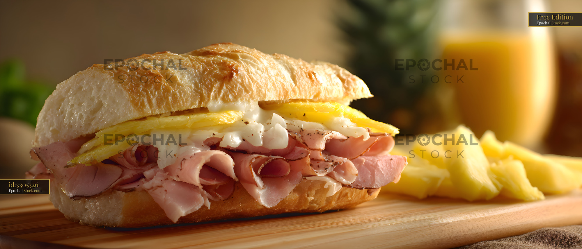 A sandwich made with ham and pineapple sits on a wooden board. A glass of juice is visible in the background. The setting is warm and inviting.