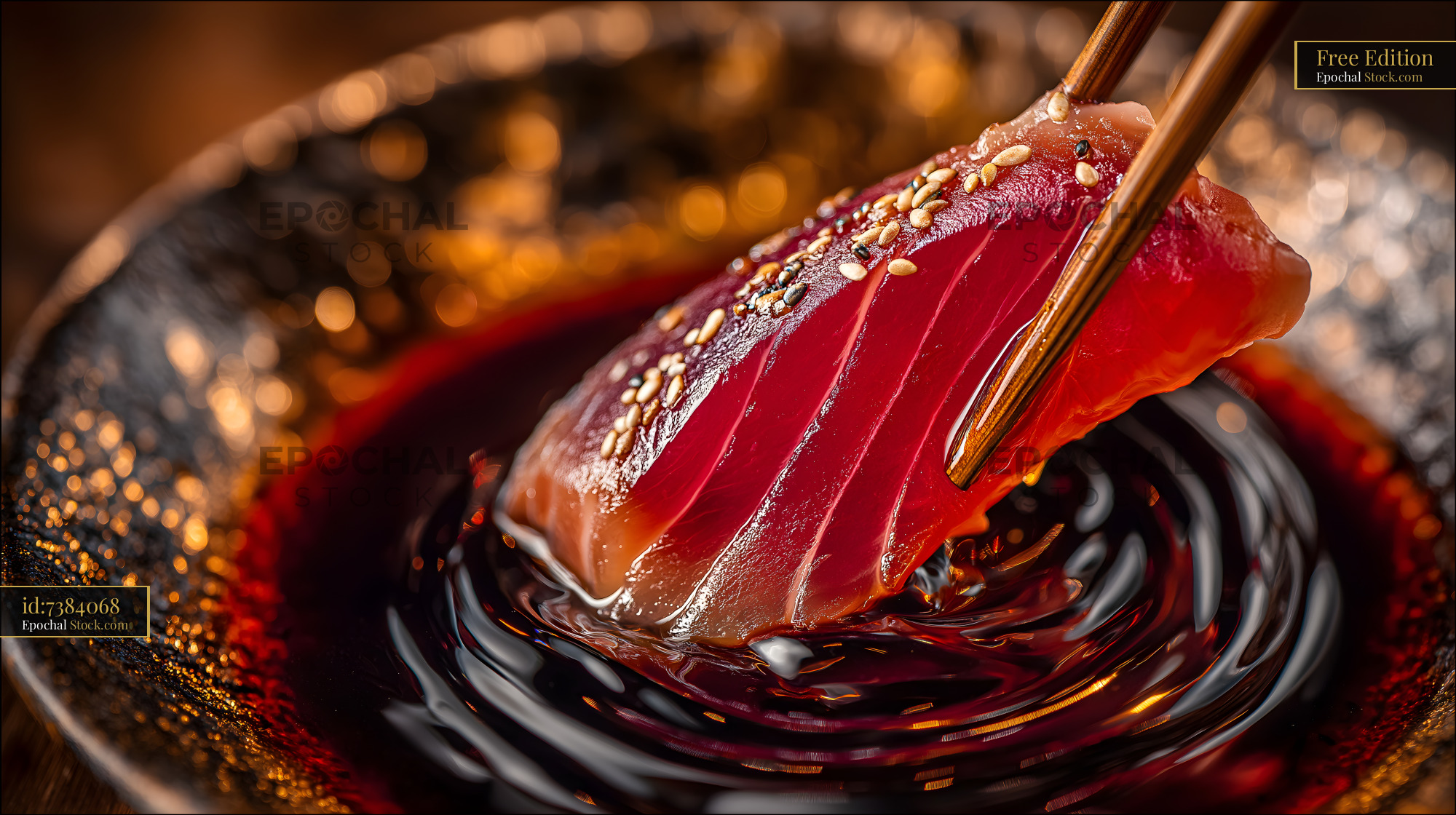 Fresh tuna piece being dipped in soy sauce Free Premium Stock Photo