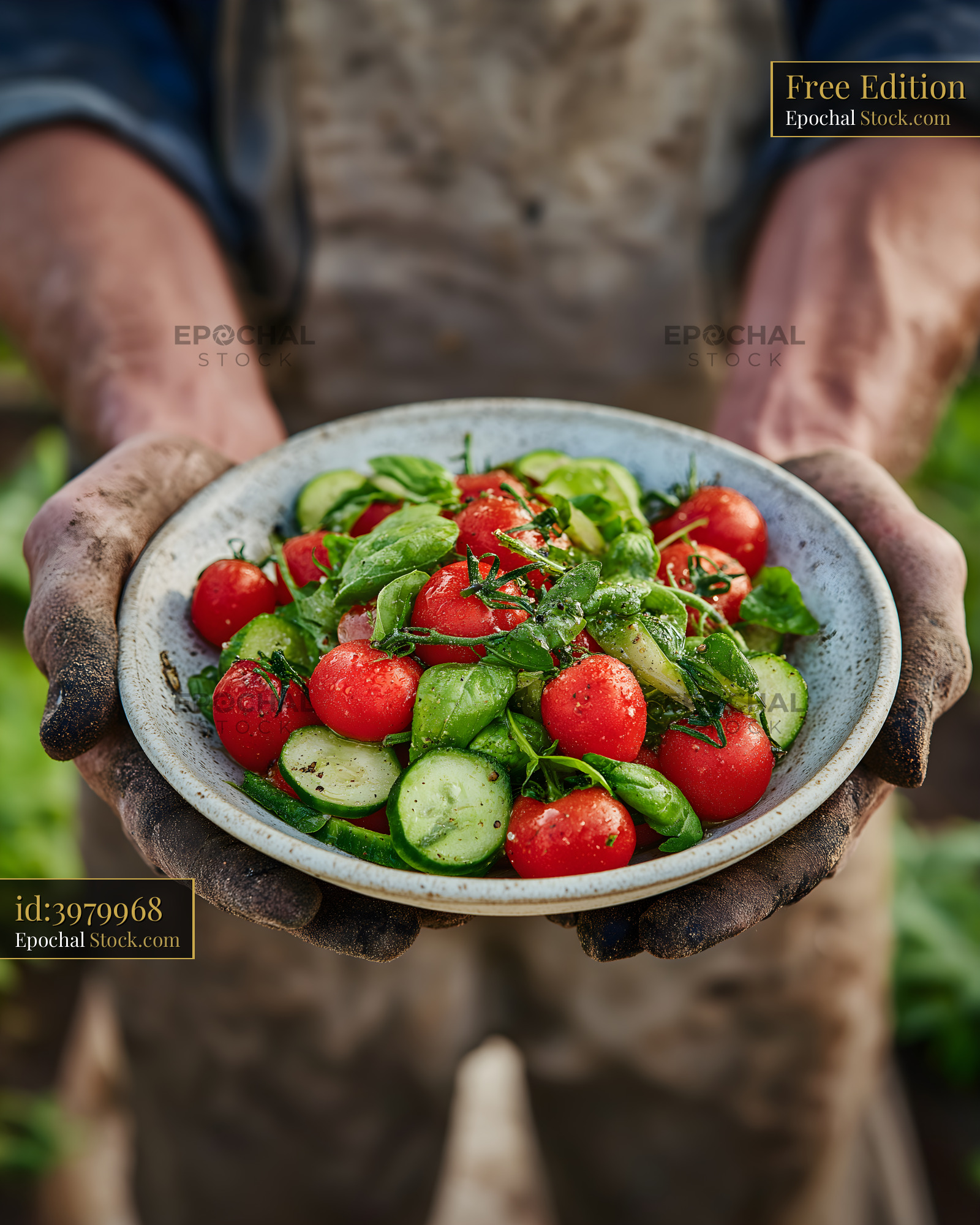 A gardener holds a bowl filled with salad that includes red tomatoes and green cucumbers. The hands show signs of working with soil. The background has plants growing in a garden.