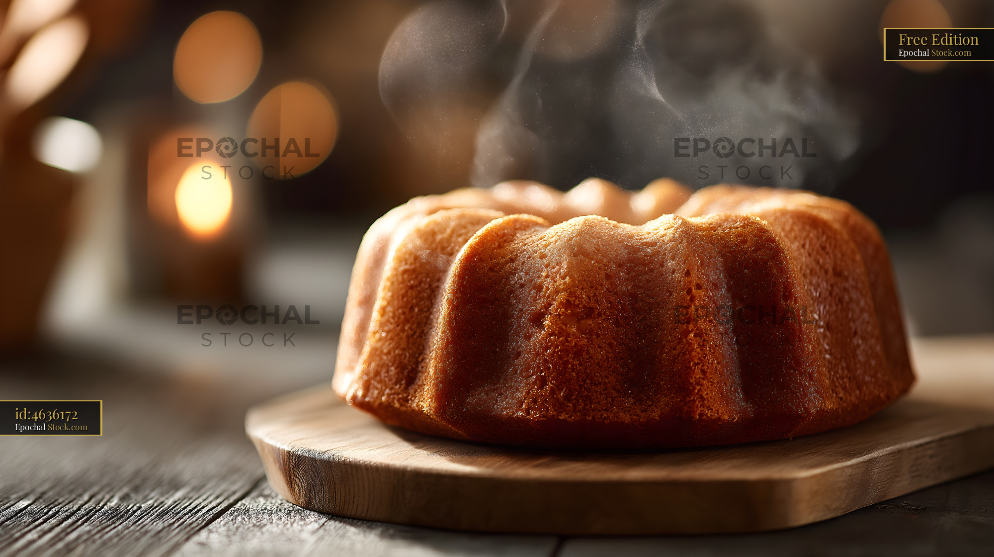 Freshly baked cake on wooden board with steam rising Free Premium Stock Photo