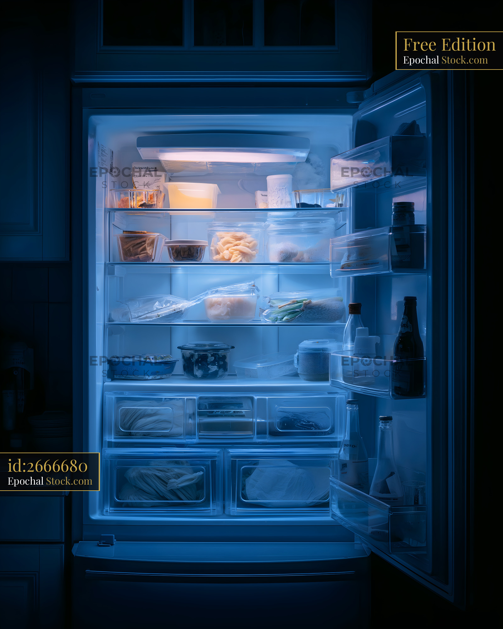 Fridge open at night shows food and drinks inside Free Premium Stock Image