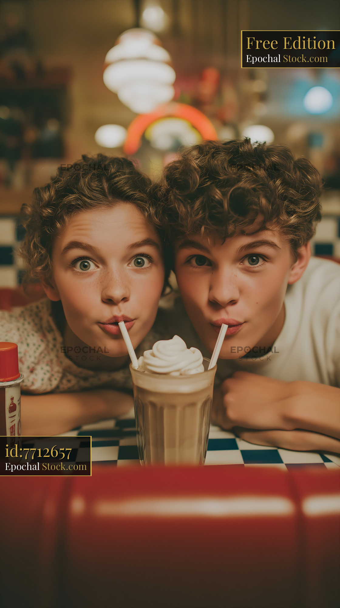 Two friends are sitting in a diner booth. They are holding a milkshake with two straws. The atmosphere is lively with colorful lights in the background.