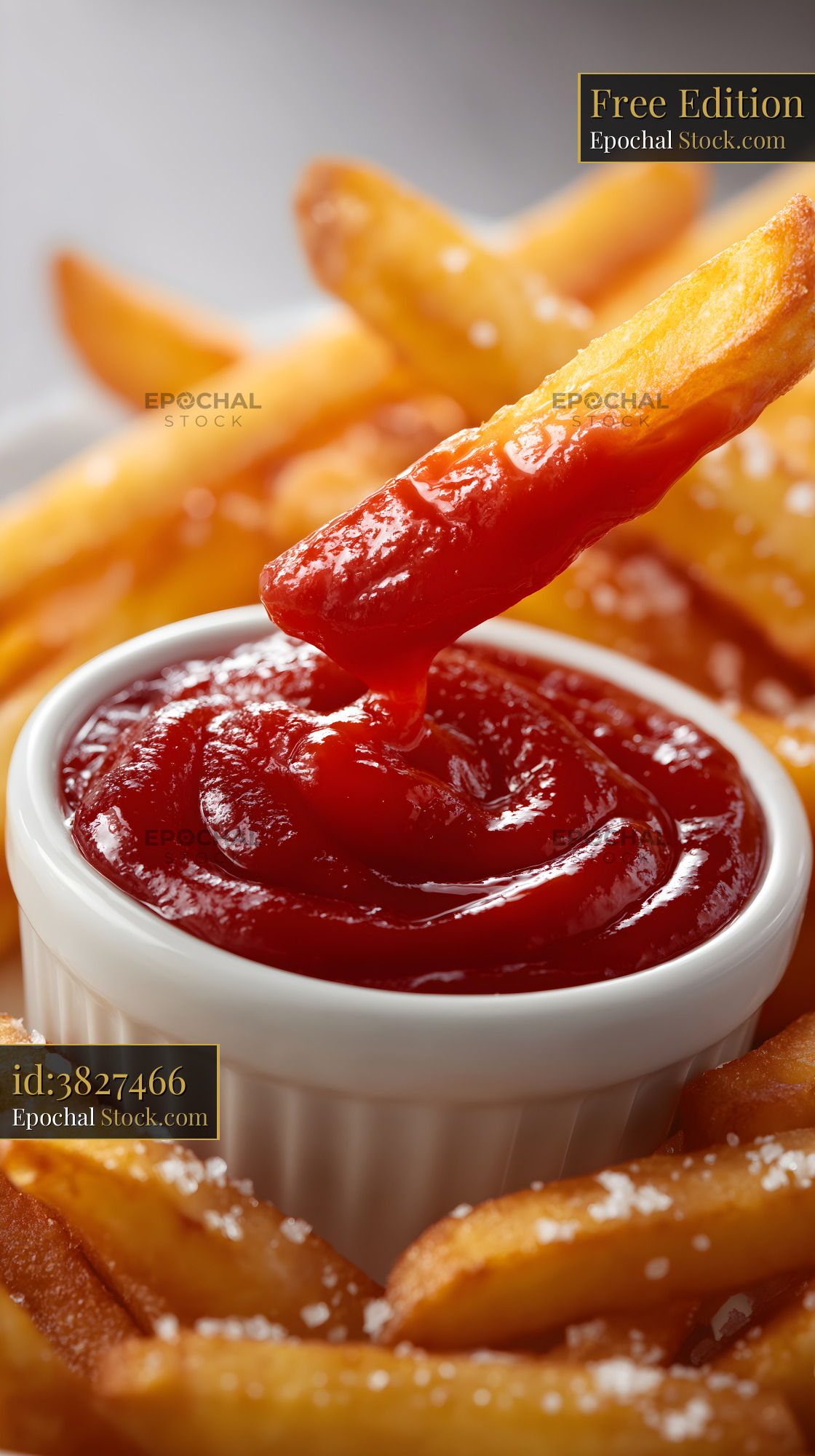 Crunchy fries are being dipped into a bowl of red ketchup. The setting is a diner in the afternoon with a focus on comfort food.