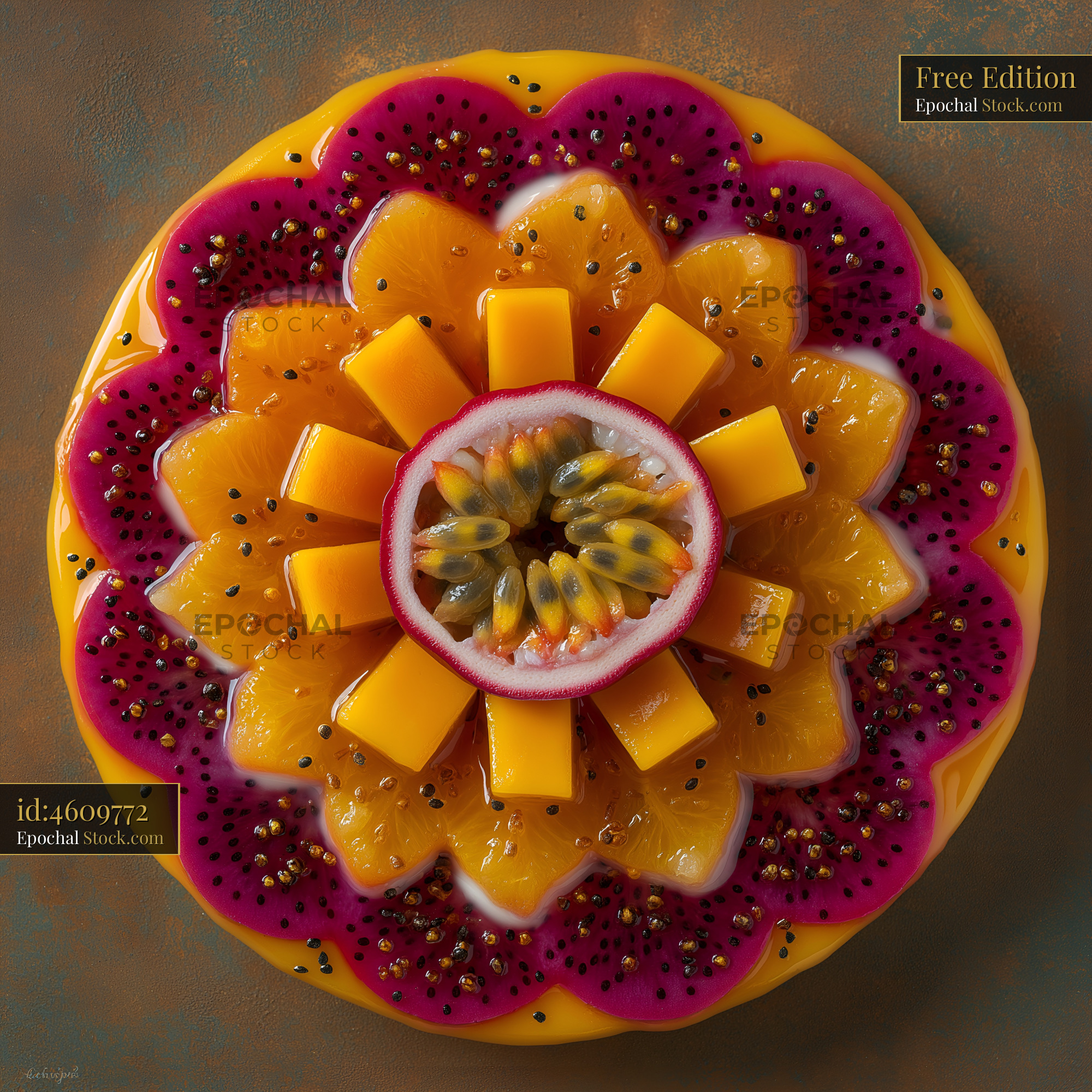 A colorful fruit display shows slices of dragon fruit, mango, and passion fruit arranged in a circle. The vibrant colors and shapes create a pleasing design.