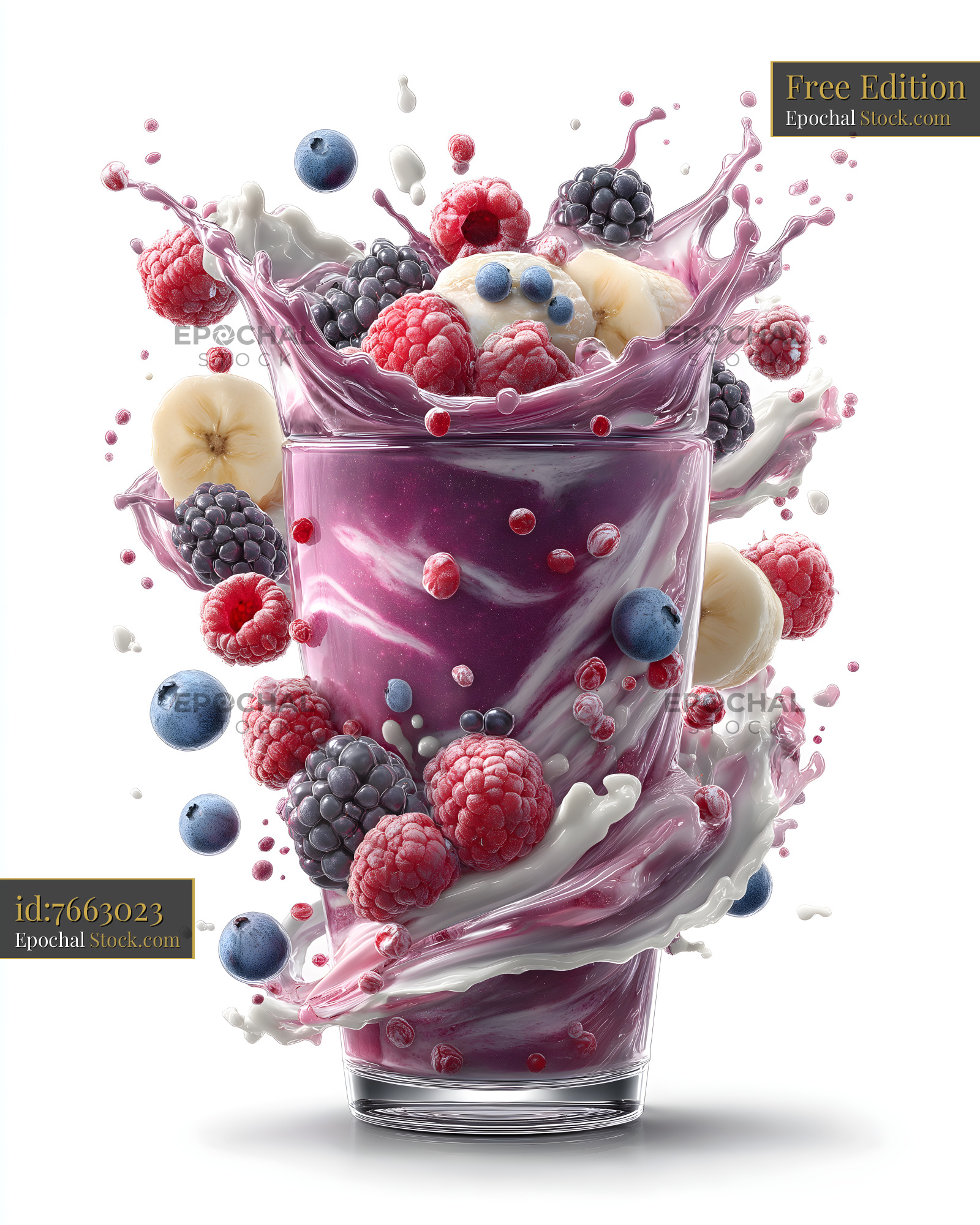 A glass filled with a fruit smoothie is bursting with color. Berries and banana slices leap out of the drink, creating a splash of flavors in the air.