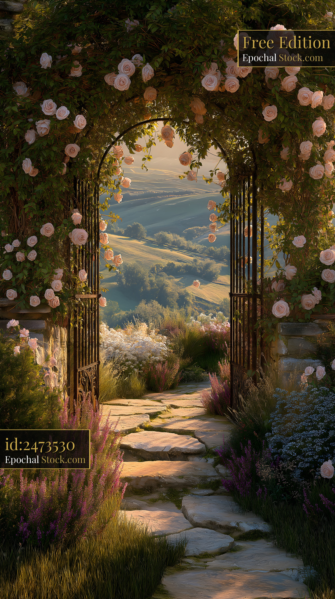 A garden gate stands open, revealing a path lined with flowers leading to rolling hills in the background. The sun casts a warm light on the scene, highlighting nature's beauty.