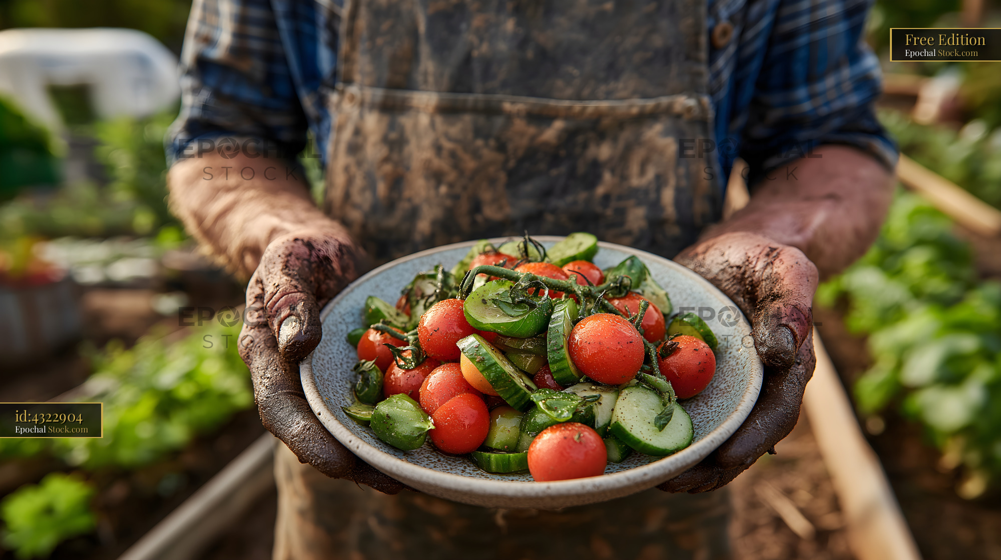 A person stands in a community garden holding a plate of fresh salad. The salad includes tomatoes and cucumbers. The gardener's hands are dirty from work in the soil.