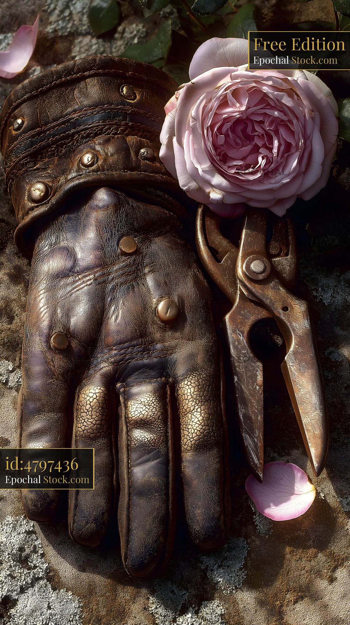Gardening gloves rest on a stone surface next to a pair of rusty scissors. A pink rose and petals lay nearby, showing a quiet moment in a garden scene.