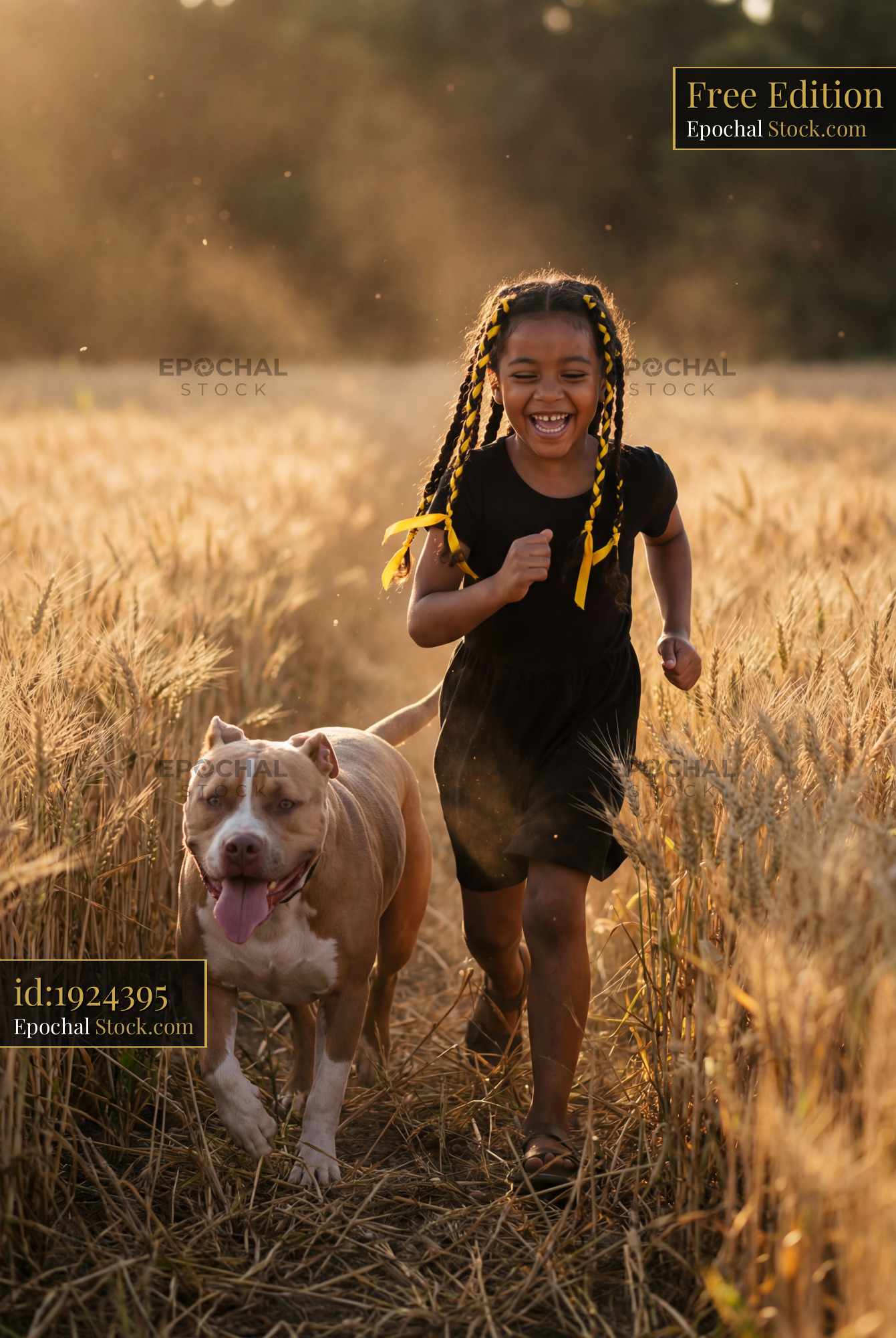Girl runs happily with dog in wheat field during late afternoon