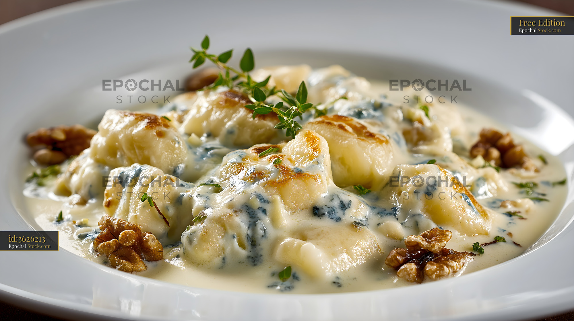 Gnocchi served in creamy sauce with walnuts and herbs Free Premium Stock Image