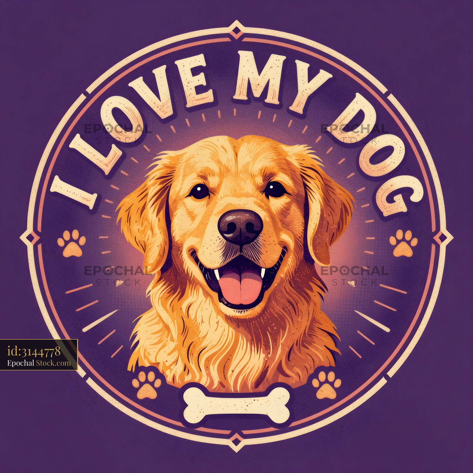 The design shows a golden retriever with a big smile. The background has a purple color. It includes text about loving dogs. This artwork shows a cheerful pet theme.
