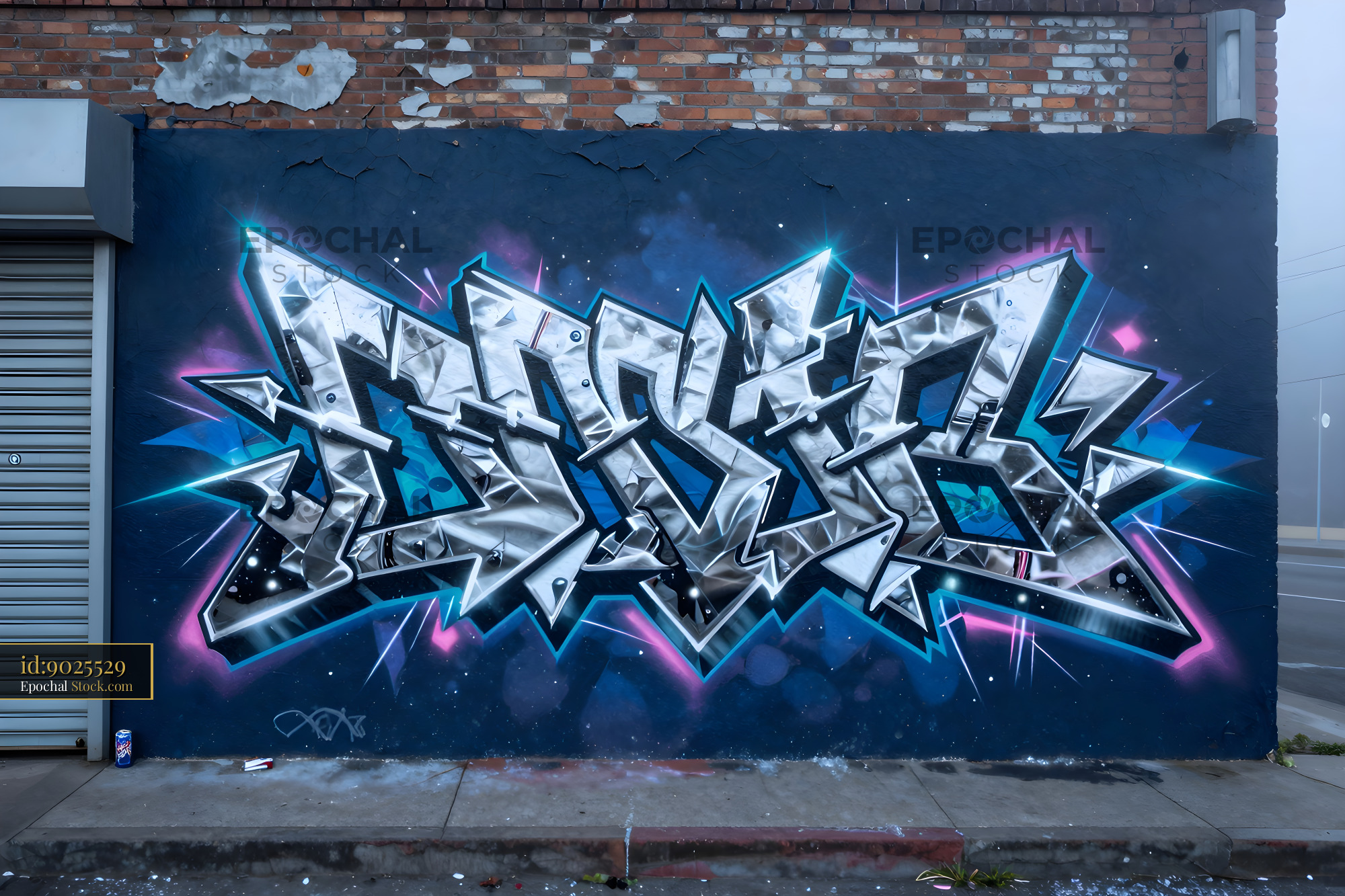 A large and colorful graffiti piece covers a brick wall in an urban area. The artwork shows sharp shapes and designs. The scene takes place early in the morning with soft light.