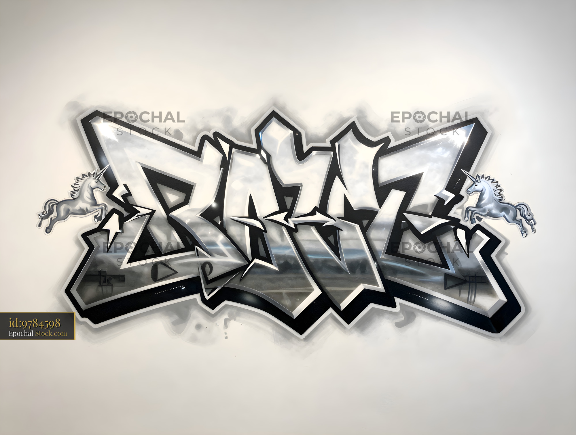 Graffiti art appears on a wall in a city location. The design features bold letters and a silver finish. This art adds color and life to the urban environment.