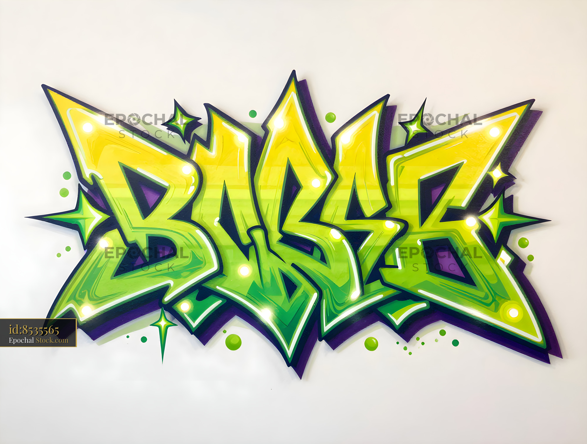 A colorful graffiti design shows bold letters on a white wall. The artwork uses green and yellow colors with sharp shapes and stars around it. It draws attention with its striking look.