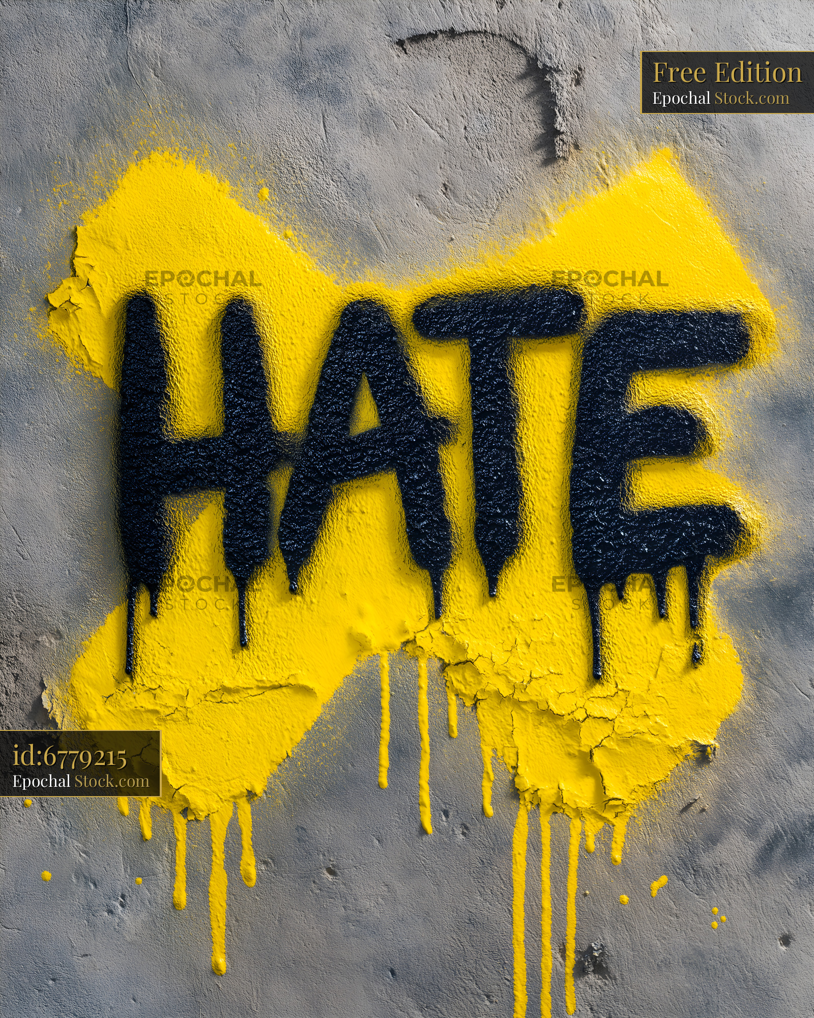 A wall is covered in gray paint. Bright yellow paint shows the word hate in bold letters. The letters drip down, showing signs of wear and aging. This creates a striking visual contrast.