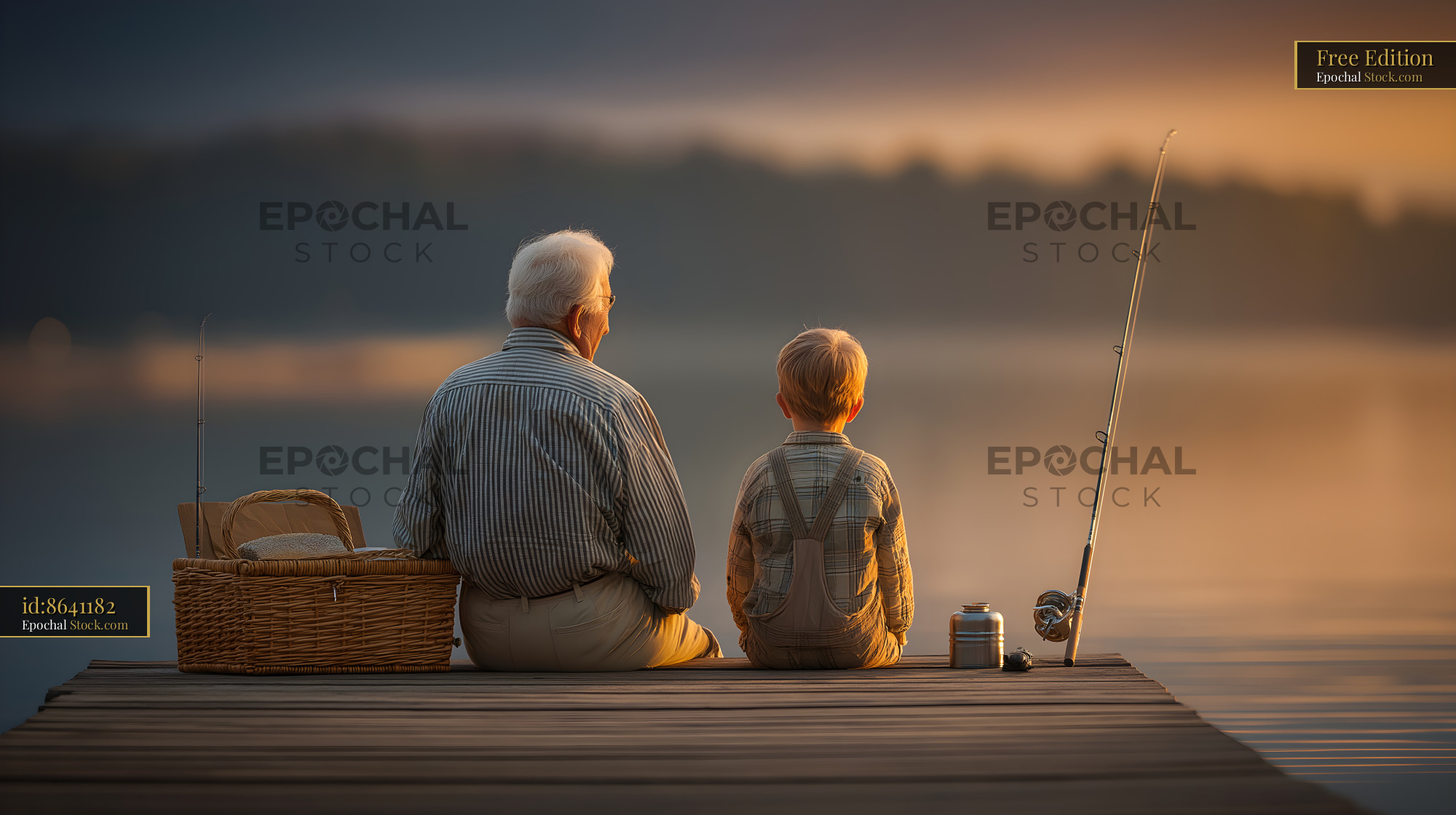 Grandfather and grandson enjoy fishing on a quiet lake dock Free Premium Stock Photo