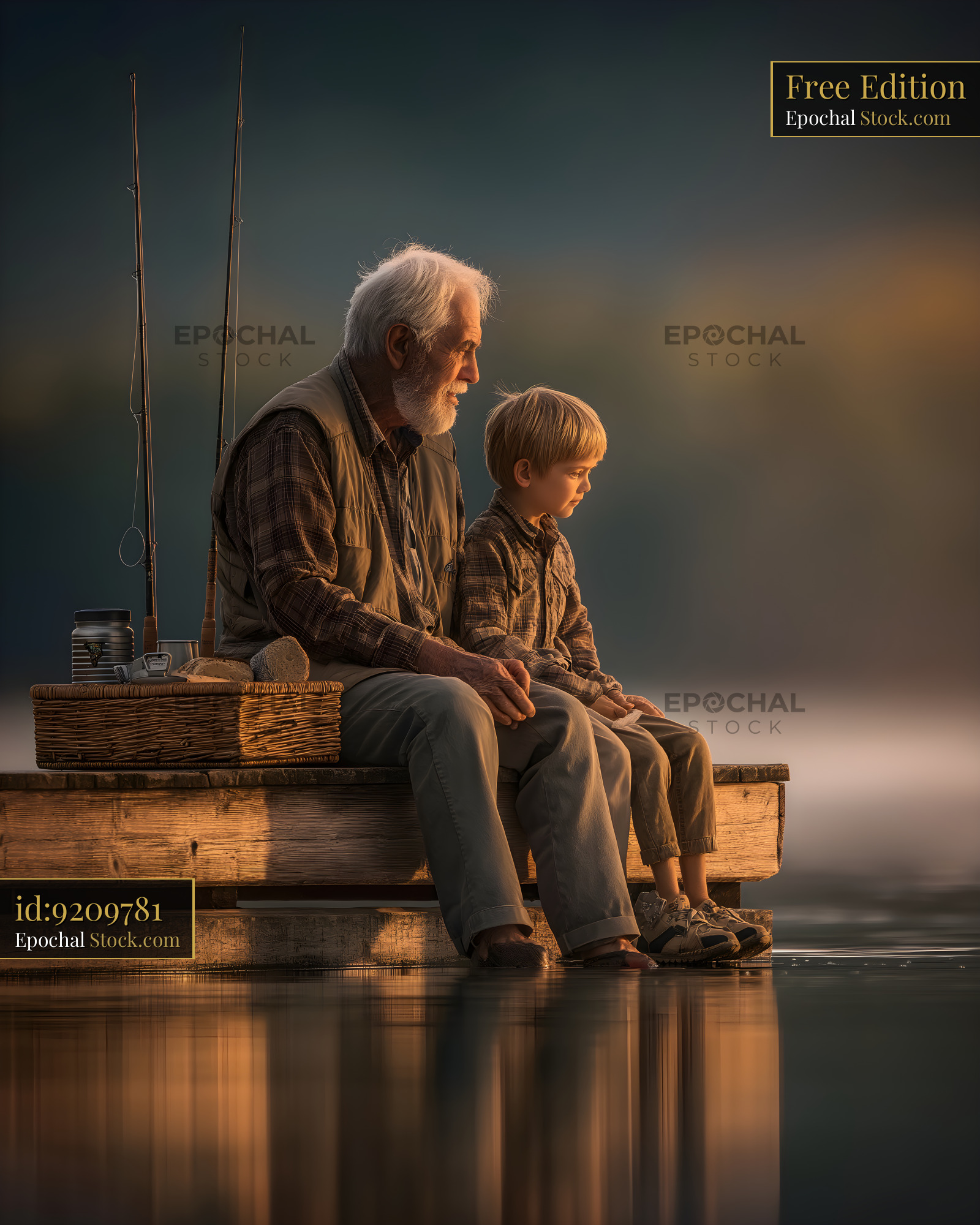 A grandfather and his grandson sit side by side on a wooden dock. They enjoy fishing and watching the water at dusk. Two fishing rods stand next to them, ready for use.