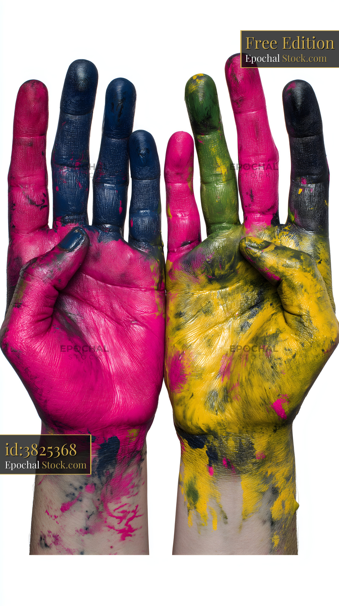 Two hands are shown covered in bright colors of paint. The hands are in different positions and are messy with splashes of yellow, pink, blue, and green.