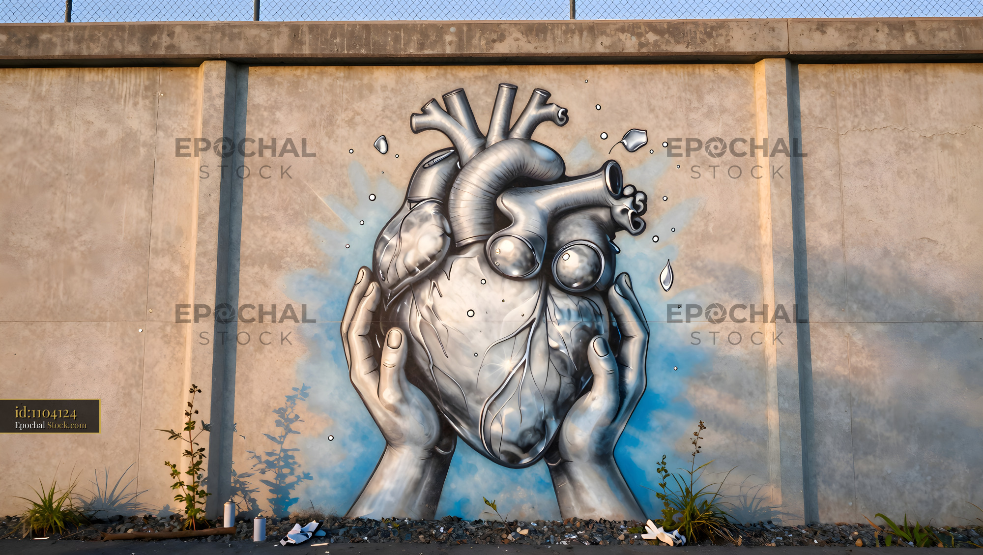 Hands hold a heart mural on a concrete wall Premium Stock Image