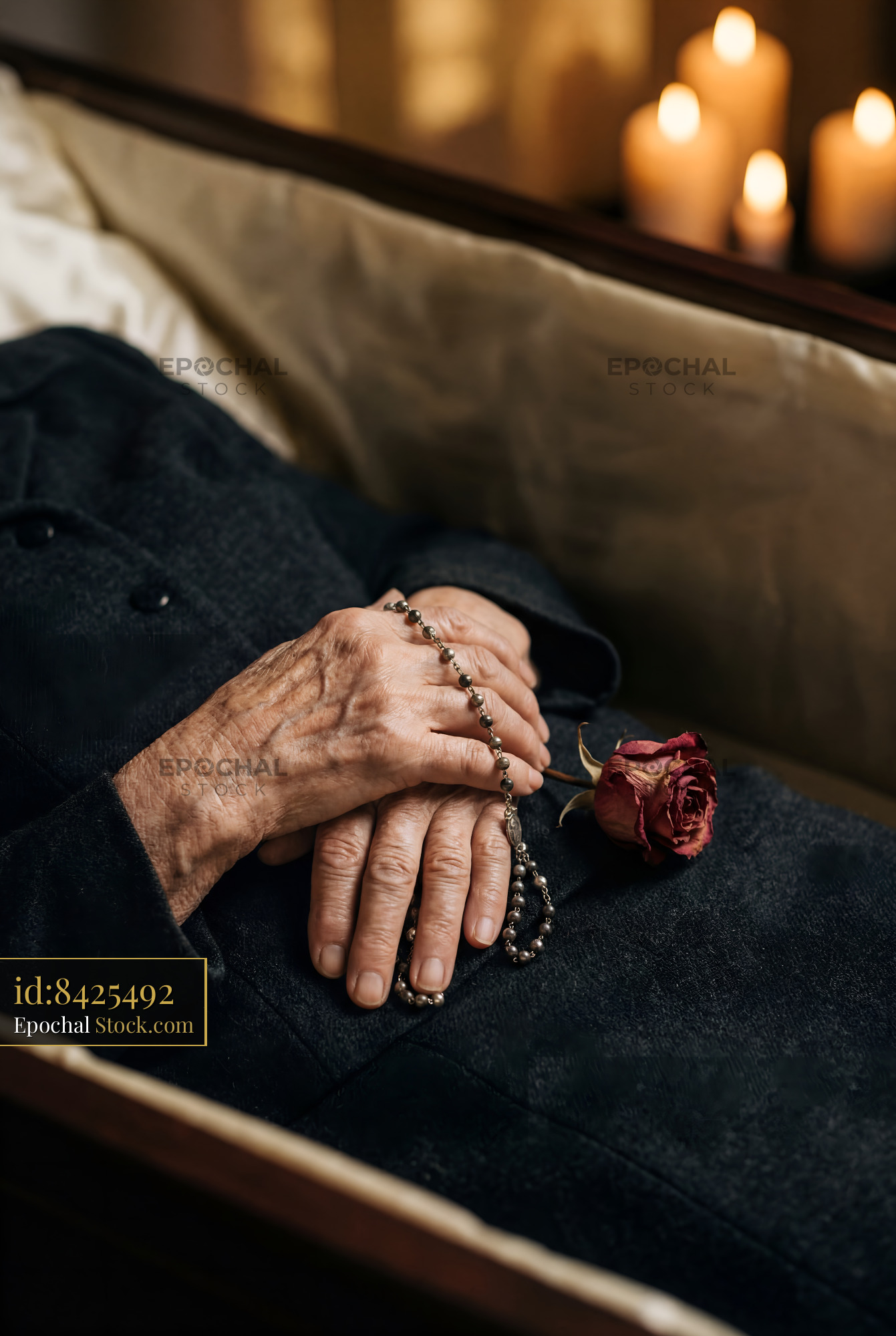 Hands are placed together with a rosary on top. A faded rose is beside them. Soft candlelight casts a warm glow around the scene. This takes place in a quiet setting.