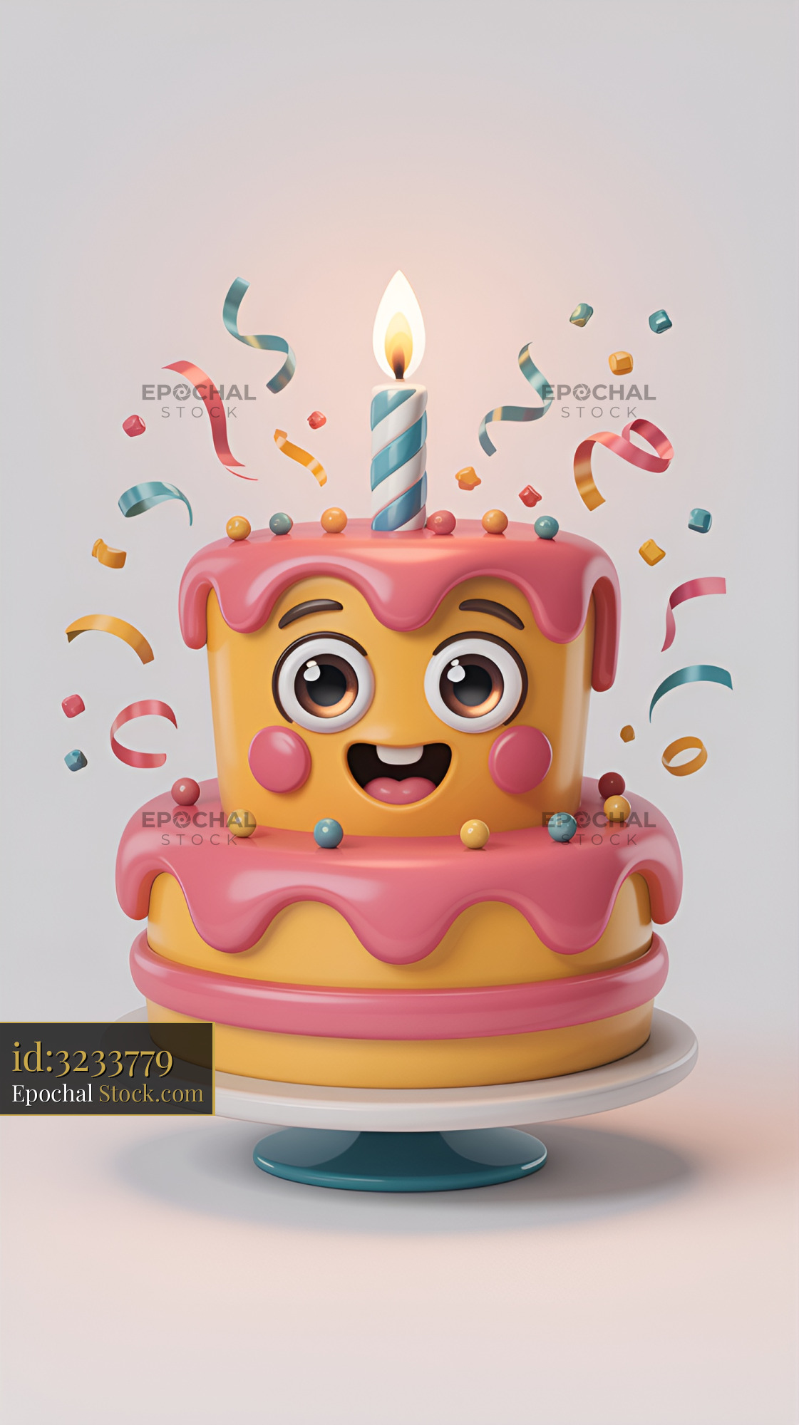 A two-tier cake features bright colors and a smiling face. It has a lit candle on top and colorful sprinkles and confetti around it. The scene is set for a celebration.