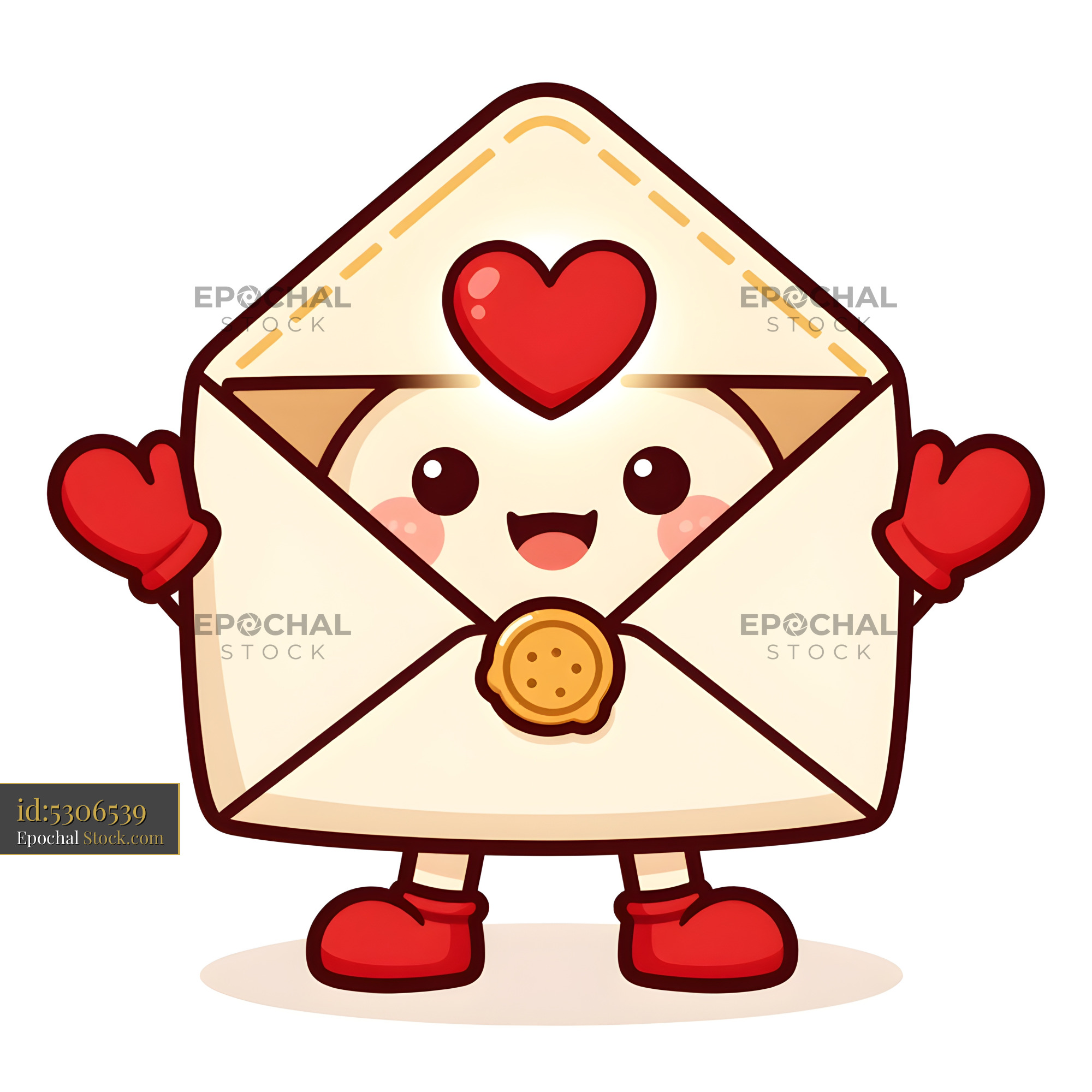 A cartoon envelope stands happily with hands. The envelope has a heart design on it. It is wearing red gloves and has a smile. The setting is bright and playful.