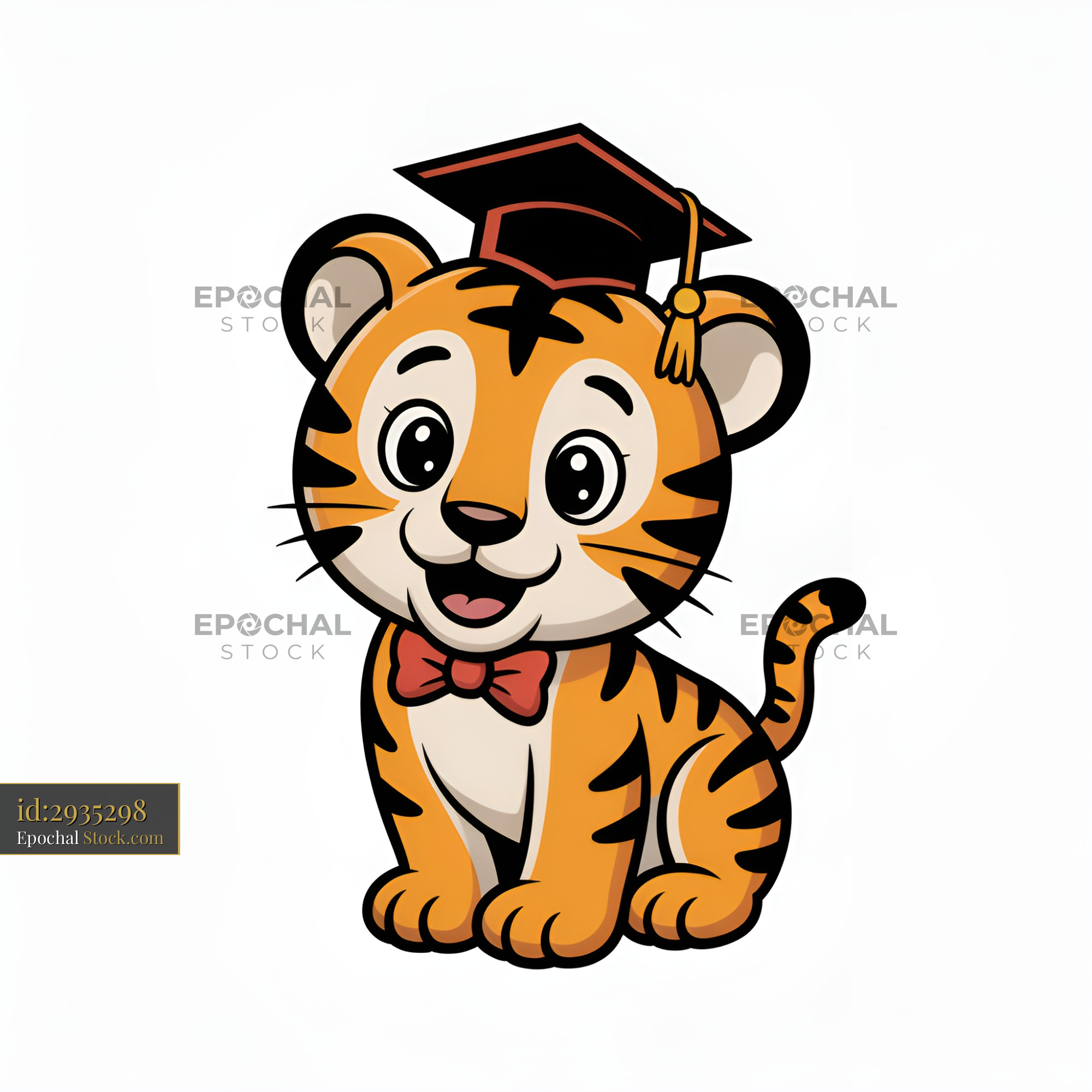 A small tiger sits and smiles while wearing a graduation cap and a red bow tie. The setting is bright and cheerful, showing a fun celebration of learning.