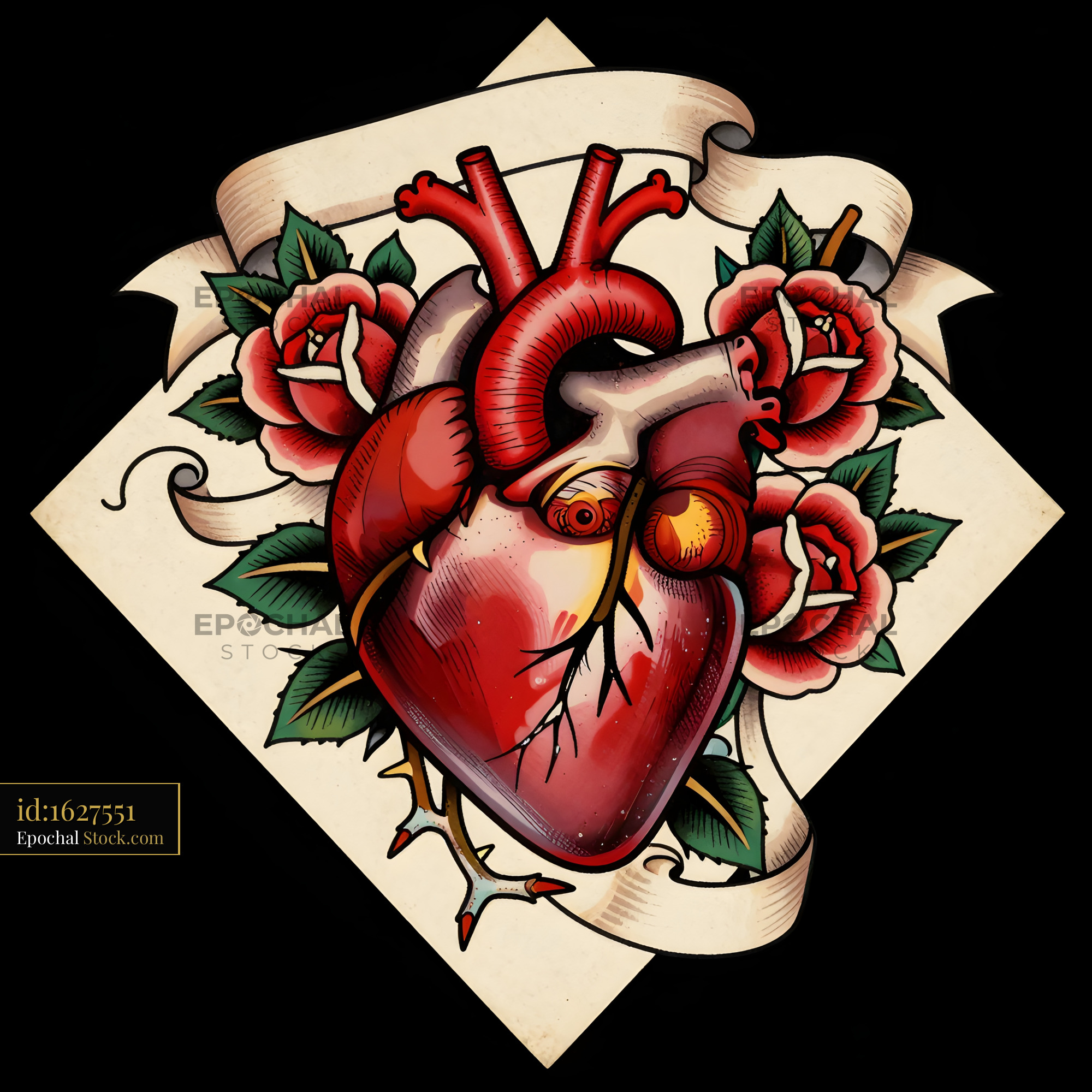 A colorful heart design shows a detailed heart surrounded by roses and a banner. The background is black. This scene captures elements of art and anatomy in a bold style.