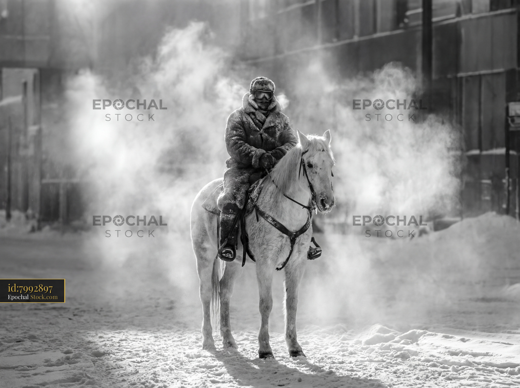 A person rides a white horse through a snowy city street. The air is filled with fog as the morning light breaks through the buildings. The scene shows a winter day with low visibility.