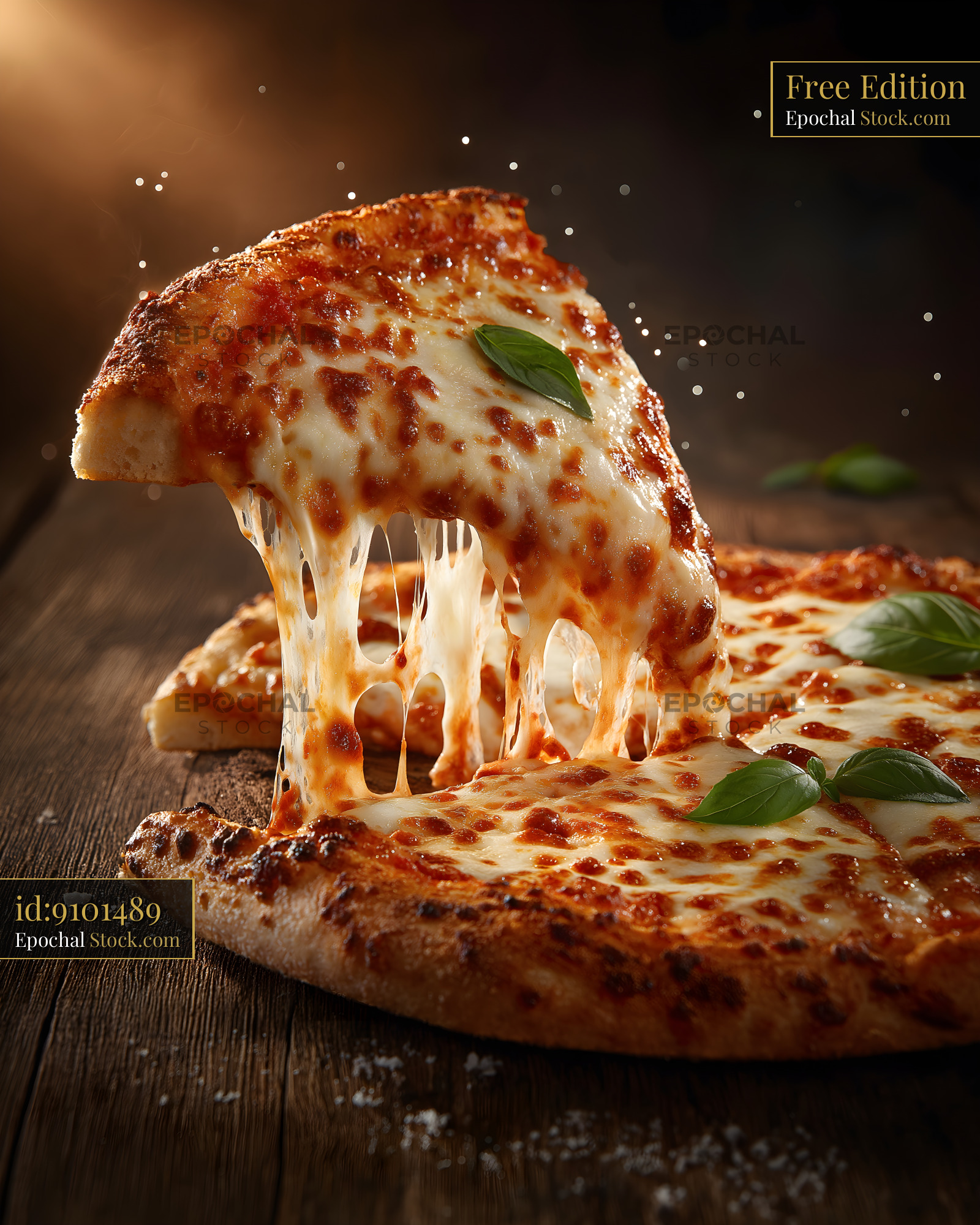 A fresh pizza sits on a wooden table. Cheese stretches as a slice is pulled away. Basil leaves are placed on top. The setting has warm lighting and a rustic feel.