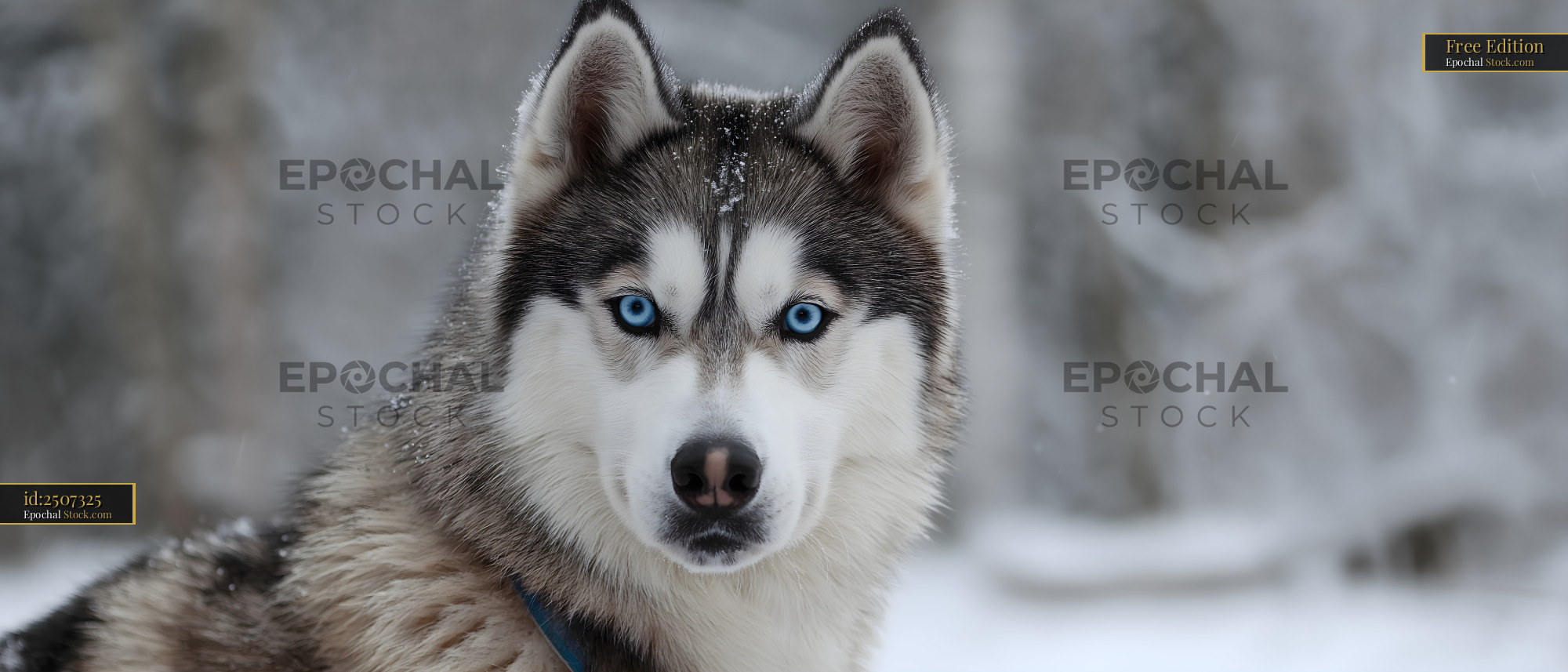 A husky dog poses in the snow-covered forest. The animal has bright blue eyes and thick fur, showing details of its coat. Snowflakes fall gently around its face and nearby trees.